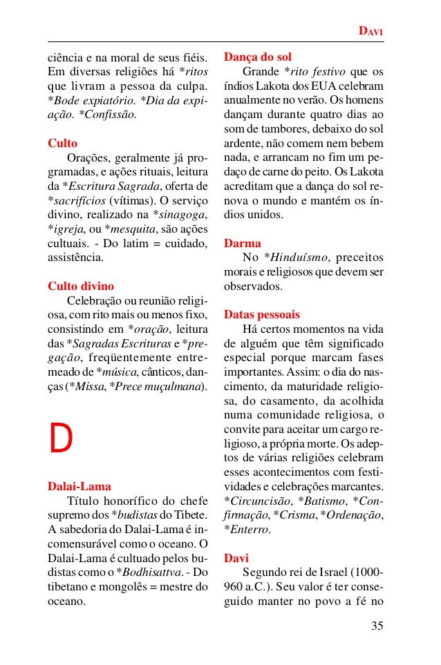 34. 34. 35 ciência e na moral de seus fiéis. Em diversas religiões há *ritos que livram a pessoa da culpa. *Bode expiatório. *Dia da expi- ação. *Confissão. Culto Orações, geralmente já pro- gramadas, e ações rituais, leitura da *Escritura Sagrada, oferta de *sacrifícios (vítimas). O serviço divino, realizado na *sinagoga, *igreja, ou *mesquita, são ações cultuais. - Do latim = cuidado, assistência. Culto divino Celebração ou reunião religi- osa, com rito mais ou menos fixo, consistindo em *oração, leitura das *Sagradas Escrituras e *pre- gação, freqüentemente entre- meado de *música, cânticos, dan- ças (*Missa, *Prece muçulmana). D Dalai-Lama Título honorífico do chefe supremo dos *budistas do Tibete. A sabedoria do Dalai-Lama é in- comensurável como o oceano. O Dalai-Lama é cultuado pelos bu- distas como o *Bodhisattva. - Do tibetano e mongolês = mestre do oceano. Dança do sol Grande *rito festivo que os índios Lakota dos EUA celebram anualmente no verão. Os homens dançam durante quatro dias ao som de tambores, debaixo do sol ardente, não comem nem bebem nada, e arrancam no fim um pe- daço de carne do peito. Os Lakota acreditam que a dança do sol re- nova o mundo e mantém os ín- dios unidos. Darma No *Hinduísmo, preceitos morais e religiosos que devem ser observados. Datas pessoais Há certos momentos na vida de alguém que têm significado especial porque marcam fases importantes.Assim: o dia do nas- cimento, da maturidade religio- sa, do casamento, da acolhida numa comunidade religiosa, o convite para aceitar um cargo re- ligioso, a própria morte. Os adep- tos de várias religiões celebram esses acontecimentos com festi- vidades e celebrações marcantes. *Circuncisão, *Batismo, *Con- firmação, *Crisma, *Ordenação, *Enterro. Davi Segundo rei de Israel (1000- 960 a.C.). Seu valor é ter conse- guido manter no povo a fé no DAVI