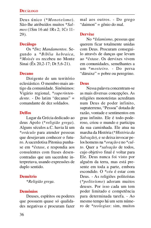 35. 35. 36 Deus único (*Monoteísmo). São-lhe atribuídos muitos *Sal- mos (1Sm 16 até 1Rs 2; 1Cr 11- 29). Decálogo Os *Dez Mandamentos. Se- gundo a *Bíblia hebraica, *Moisés os recebeu no Monte Sinai (Êx 20,2-17; Dt 5,6-21). Decano Dirigente de um território eclesiástico. O membro mais an- tigo da comunidade. Sinônimos: Vigário regional, *superinten- dente. - Do latim “decanus” = comandante de dez soldados. Delfos Lugar da Grécia dedicado ao deus Apolo (*religião grega). Alguns séculos a.C. havia lá um *oráculo para atender pessoas que desejavam conhecer o futu- ro.Asacerdotisa Pitonisa punha- se em *êxtase, e respondia aos consulentes com frases desen- contradas que um sacerdote in- terpretava, usando expressões de duplo sentido. Demétrio *Religião grega. Demônios Deuses, espíritos ou poderes que possuem quase só qualida- des negativas e procuram fazer mal aos outros. - Do grego “daimon” = gênio do mal. Dervixe No *Islamismo, pessoas que querem ficar totalmente unidas com Deus. Procuram consegui- lo através de danças que levam ao *êxtase. Os dervixes vivem em comunidades, semelhantes a um *mosteiro. - Do persa “däruixe” = pobre ou peregrino. Deus Nessa palavra concentram-se as mais diversas concepções. As religiões monoteístas acreditam num Deus de poder infinito, supraterreno, “Pessoa” dotada de razão, vontade e sentimentos em grau infinito. Ele é todo-pode- roso, criou o mundo e participa da sua caminhada. Ele atua na marcha da História (*História da Salvação), e se deixa invocar pe- los homens na *oração e no *cul- to. Quer a *salvação de todos, cujo objetivo final é voltar para Ele. Deus nunca foi visto por alguém da terra, mas está pre- sente em toda a parte, embora escondido. O *céu é estar com Deus. - As religiões politeístas (*politeísmo) adoram muitos deuses. Por isso cada um tem poder limitado e competência para determinada tarefa. - Ao mesmo tempo há um sem núme- ro de *teologias: sim, muitos DECÁLOGO