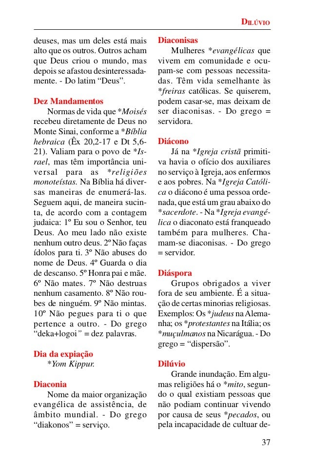 36. 36. 37 deuses, mas um deles está mais alto que os outros. Outros acham que Deus criou o mundo, mas depois se afastou desinteressada- mente. - Do latim “Deus”. Dez Mandamentos Normas de vida que *Moisés recebeu diretamente de Deus no Monte Sinai, conforme a *Bíblia hebraica (Êx 20,2-17 e Dt 5,6- 21). Valiam para o povo de *Is- rael, mas têm importância uni- versal para as *religiões monoteístas. Na Bíblia há diver- sas maneiras de enumerá-las. Seguem aqui, de maneira sucin- ta, de acordo com a contagem judaica: 1º Eu sou o Senhor, teu Deus. Ao meu lado não existe nenhum outro deus. 2º Não faças ídolos para ti. 3º Não abuses do nome de Deus. 4º Guarda o dia de descanso. 5º Honra pai e mãe. 6º Não mates. 7º Não destruas nenhum casamento. 8º Não rou- bes de ninguém. 9º Não mintas. 10º Não pegues para ti o que pertence a outro. - Do grego “deka+logoi” = dez palavras. Dia da expiação *Yom Kippur. Diaconia Nome da maior organização evangélica de assistência, de âmbito mundial. - Do grego “diakonos” = serviço. Diaconisas Mulheres *evangélicas que vivem em comunidade e ocu- pam-se com pessoas necessita- das. Têm vida semelhante às *freiras católicas. Se quiserem, podem casar-se, mas deixam de ser diaconisas. - Do grego = servidora. Diácono Já na *Igreja cristã primiti- va havia o ofício dos auxiliares no serviço à Igreja, aos enfermos e aos pobres. Na *Igreja Católi- ca o diácono é uma pessoa orde- nada, que está um grau abaixo do *sacerdote. - Na *Igreja evangé- lica o diaconato está franqueado também para mulheres. Cha- mam-se diaconisas. - Do grego = servidor. Diáspora Grupos obrigados a viver fora de seu ambiente. É a situa- ção de certas minorias religiosas. Exemplos: Os *judeus naAlema- nha; os *protestantes na Itália; os *muçulmanos na Nicarágua. - Do grego = “dispersão”. Dilúvio Grande inundação. Em algu- mas religiões há o *mito, segun- do o qual existiam pessoas que não podiam continuar vivendo por causa de seus *pecados, ou pela incapacidade de cultuar de- DILÚVIO
