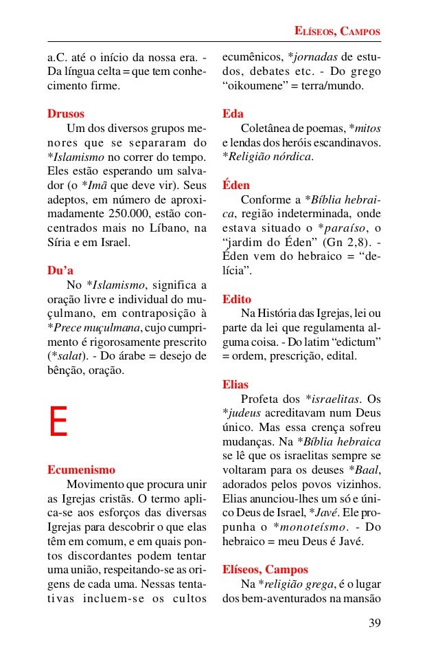 38. 38. 39 a.C. até o início da nossa era. - Da língua celta = que tem conhe- cimento firme. Drusos Um dos diversos grupos me- nores que se separaram do *Islamismo no correr do tempo. Eles estão esperando um salva- dor (o *Imã que deve vir). Seus adeptos, em número de aproxi- madamente 250.000, estão con- centrados mais no Líbano, na Síria e em Israel. Du’a No *Islamismo, significa a oração livre e individual do mu- çulmano, em contraposição à *Prece muçulmana, cujo cumpri- mento é rigorosamente prescrito (*salat). - Do árabe = desejo de bênção, oração. E Ecumenismo Movimento que procura unir as Igrejas cristãs. O termo apli- ca-se aos esforços das diversas Igrejas para descobrir o que elas têm em comum, e em quais pon- tos discordantes podem tentar uma união, respeitando-se as ori- gens de cada uma. Nessas tenta- tivas incluem-se os cultos ecumênicos, *jornadas de estu- dos, debates etc. - Do grego “oikoumene” = terra/mundo. Eda Coletânea de poemas, *mitos e lendas dos heróis escandinavos. *Religião nórdica. Éden Conforme a *Bíblia hebrai- ca, região indeterminada, onde estava situado o *paraíso, o “jardim do Éden” (Gn 2,8). - Éden vem do hebraico = “de- lícia”. Edito Na História das Igrejas, lei ou parte da lei que regulamenta al- guma coisa. - Do latim “edictum” = ordem, prescrição, edital. Elias Profeta dos *israelitas. Os *judeus acreditavam num Deus único. Mas essa crença sofreu mudanças. Na *Bíblia hebraica se lê que os israelitas sempre se voltaram para os deuses *Baal, adorados pelos povos vizinhos. Elias anunciou-lhes um só e úni- co Deus de Israel, *Javé. Ele pro- punha o *monoteísmo. - Do hebraico = meu Deus é Javé. Elíseos, Campos Na *religião grega, é o lugar dos bem-aventurados na mansão ELÍSEOS, CAMPOS