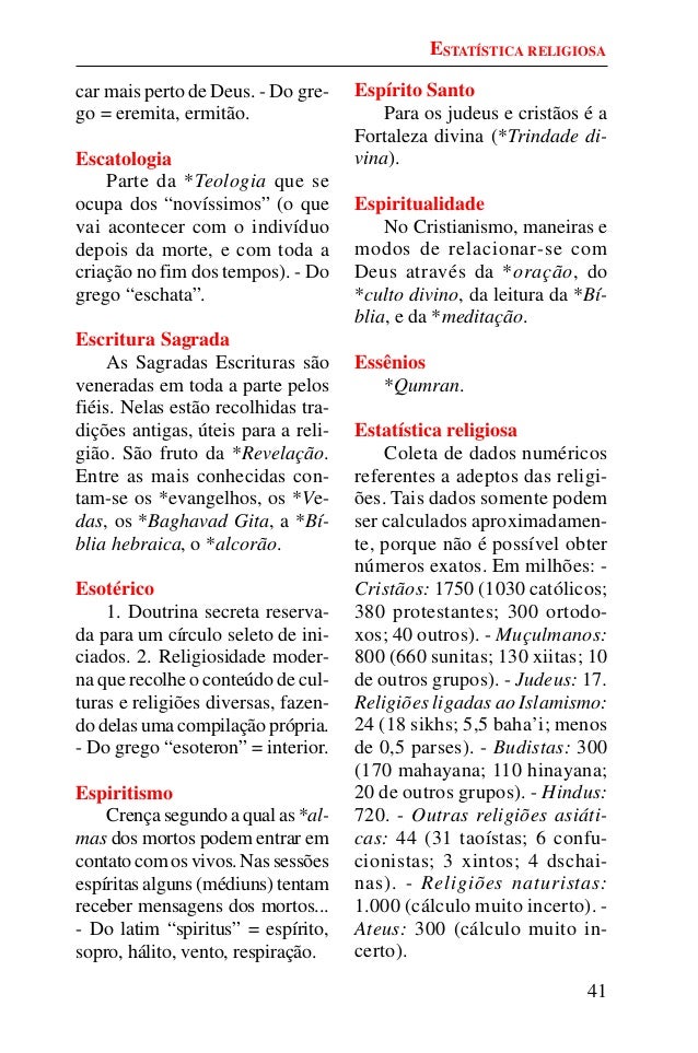 40. 40. 41 car mais perto de Deus. - Do gre- go = eremita, ermitão. Escatologia Parte da *Teologia que se ocupa dos “novíssimos” (o que vai acontecer com o indivíduo depois da morte, e com toda a criação no fim dos tempos). - Do grego “eschata”. Escritura Sagrada As Sagradas Escrituras são veneradas em toda a parte pelos fiéis. Nelas estão recolhidas tra- dições antigas, úteis para a reli- gião. São fruto da *Revelação. Entre as mais conhecidas con- tam-se os *evangelhos, os *Ve- das, os *Baghavad Gita, a *Bí- blia hebraica, o *alcorão. Esotérico 1. Doutrina secreta reserva- da para um círculo seleto de ini- ciados. 2. Religiosidade moder- na que recolhe o conteúdo de cul- turas e religiões diversas, fazen- do delas uma compilação própria. - Do grego “esoteron” = interior. Espiritismo Crença segundo a qual as *al- mas dos mortos podem entrar em contato com os vivos. Nas sessões espíritas alguns (médiuns) tentam receber mensagens dos mortos... - Do latim “spiritus” = espírito, sopro, hálito, vento, respiração. Espírito Santo Para os judeus e cristãos é a Fortaleza divina (*Trindade di- vina). Espiritualidade No Cristianismo, maneiras e modos de relacionar-se com Deus através da *oração, do *culto divino, da leitura da *Bí- blia, e da *meditação. Essênios *Qumran. Estatística religiosa Coleta de dados numéricos referentes a adeptos das religi- ões. Tais dados somente podem ser calculados aproximadamen- te, porque não é possível obter números exatos. Em milhões: - Cristãos: 1750 (1030 católicos; 380 protestantes; 300 ortodo- xos; 40 outros). - Muçulmanos: 800 (660 sunitas; 130 xiitas; 10 de outros grupos). - Judeus: 17. Religiões ligadas ao Islamismo: 24 (18 sikhs; 5,5 baha’i; menos de 0,5 parses). - Budistas: 300 (170 mahayana; 110 hinayana; 20 de outros grupos). - Hindus: 720. - Outras religiões asiáti- cas: 44 (31 taoístas; 6 confu- cionistas; 3 xintos; 4 dschai- nas). - Religiões naturistas: 1.000 (cálculo muito incerto). - Ateus: 300 (cálculo muito in- certo). ESTATÍSTICA RELIGIOSA