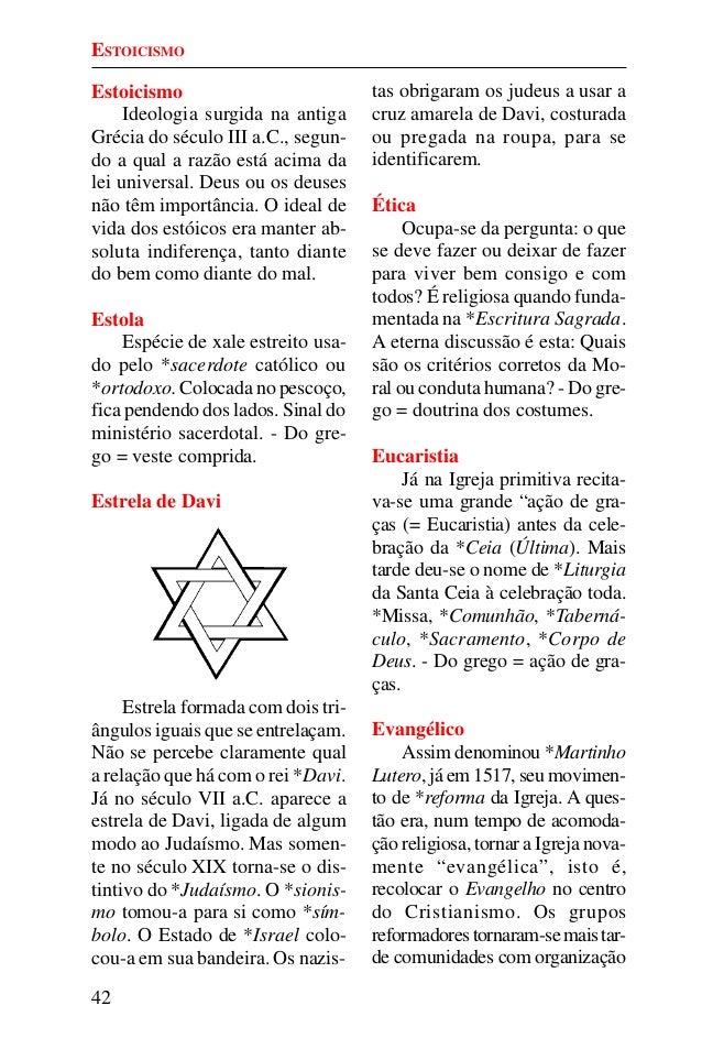 41. 41. 42 Estoicismo Ideologia surgida na antiga Grécia do século III a.C., segun- do a qual a razão está acima da lei universal. Deus ou os deuses não têm importância. O ideal de vida dos estóicos era manter ab- soluta indiferença, tanto diante do bem como diante do mal. Estola Espécie de xale estreito usa- do pelo *sacerdote católico ou *ortodoxo. Colocada no pescoço, fica pendendo dos lados. Sinal do ministério sacerdotal. - Do gre- go = veste comprida. Estrela de Davi Estrela formada com dois tri- ângulos iguais que se entrelaçam. Não se percebe claramente qual a relação que há com o rei *Davi. Já no século VII a.C. aparece a estrela de Davi, ligada de algum modo ao Judaísmo. Mas somen- te no século XIX torna-se o dis- tintivo do *Judaísmo. O *sionis- mo tomou-a para si como *sím- bolo. O Estado de *Israel colo- cou-a em sua bandeira. Os nazis- tas obrigaram os judeus a usar a cruz amarela de Davi, costurada ou pregada na roupa, para se identificarem. Ética Ocupa-se da pergunta: o que se deve fazer ou deixar de fazer para viver bem consigo e com todos? É religiosa quando funda- mentada na *Escritura Sagrada. A eterna discussão é esta: Quais são os critérios corretos da Mo- ral ou conduta humana? - Do gre- go = doutrina dos costumes. Eucaristia Já na Igreja primitiva recita- va-se uma grande “ação de gra- ças (= Eucaristia) antes da cele- bração da *Ceia (Última). Mais tarde deu-se o nome de *Liturgia da Santa Ceia à celebração toda. *Missa, *Comunhão, *Taberná- culo, *Sacramento, *Corpo de Deus. - Do grego = ação de gra- ças. Evangélico Assim denominou *Martinho Lutero, já em 1517, seu movimen- to de *reforma da Igreja. A ques- tão era, num tempo de acomoda- ção religiosa, tornar a Igreja nova- mente “evangélica”, isto é, recolocar o Evangelho no centro do Cristianismo. Os grupos reformadorestornaram-semaistar- de comunidades com organização ESTOICISMO