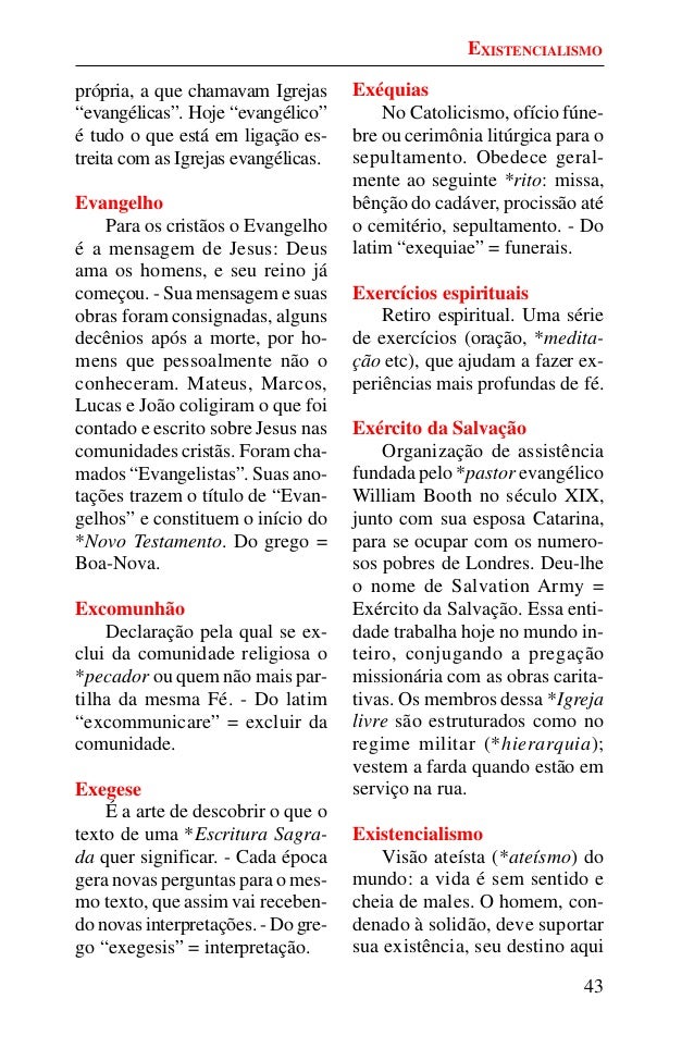 42. 42. 43 própria, a que chamavam Igrejas “evangélicas”. Hoje “evangélico” é tudo o que está em ligação es- treita com as Igrejas evangélicas. Evangelho Para os cristãos o Evangelho é a mensagem de Jesus: Deus ama os homens, e seu reino já começou. - Sua mensagem e suas obras foram consignadas, alguns decênios após a morte, por ho- mens que pessoalmente não o conheceram. Mateus, Marcos, Lucas e João coligiram o que foi contado e escrito sobre Jesus nas comunidades cristãs. Foram cha- mados “Evangelistas”. Suas ano- tações trazem o título de “Evan- gelhos” e constituem o início do *Novo Testamento. Do grego = Boa-Nova. Excomunhão Declaração pela qual se ex- clui da comunidade religiosa o *pecador ou quem não mais par- tilha da mesma Fé. - Do latim “excommunicare” = excluir da comunidade. Exegese É a arte de descobrir o que o texto de uma *Escritura Sagra- da quer significar. - Cada época gera novas perguntas para o mes- mo texto, que assim vai receben- do novas interpretações. - Do gre- go “exegesis” = interpretação. Exéquias No Catolicismo, ofício fúne- bre ou cerimônia litúrgica para o sepultamento. Obedece geral- mente ao seguinte *rito: missa, bênção do cadáver, procissão até o cemitério, sepultamento. - Do latim “exequiae” = funerais. Exercícios espirituais Retiro espiritual. Uma série de exercícios (oração, *medita- ção etc), que ajudam a fazer ex- periências mais profundas de fé. Exército da Salvação Organização de assistência fundada pelo *pastor evangélico William Booth no século XIX, junto com sua esposa Catarina, para se ocupar com os numero- sos pobres de Londres. Deu-lhe o nome de Salvation Army = Exército da Salvação. Essa enti- dade trabalha hoje no mundo in- teiro, conjugando a pregação missionária com as obras carita- tivas. Os membros dessa *Igreja livre são estruturados como no regime militar (*hierarquia); vestem a farda quando estão em serviço na rua. Existencialismo Visão ateísta (*ateísmo) do mundo: a vida é sem sentido e cheia de males. O homem, con- denado à solidão, deve suportar sua existência, seu destino aqui EXISTENCIALISMO