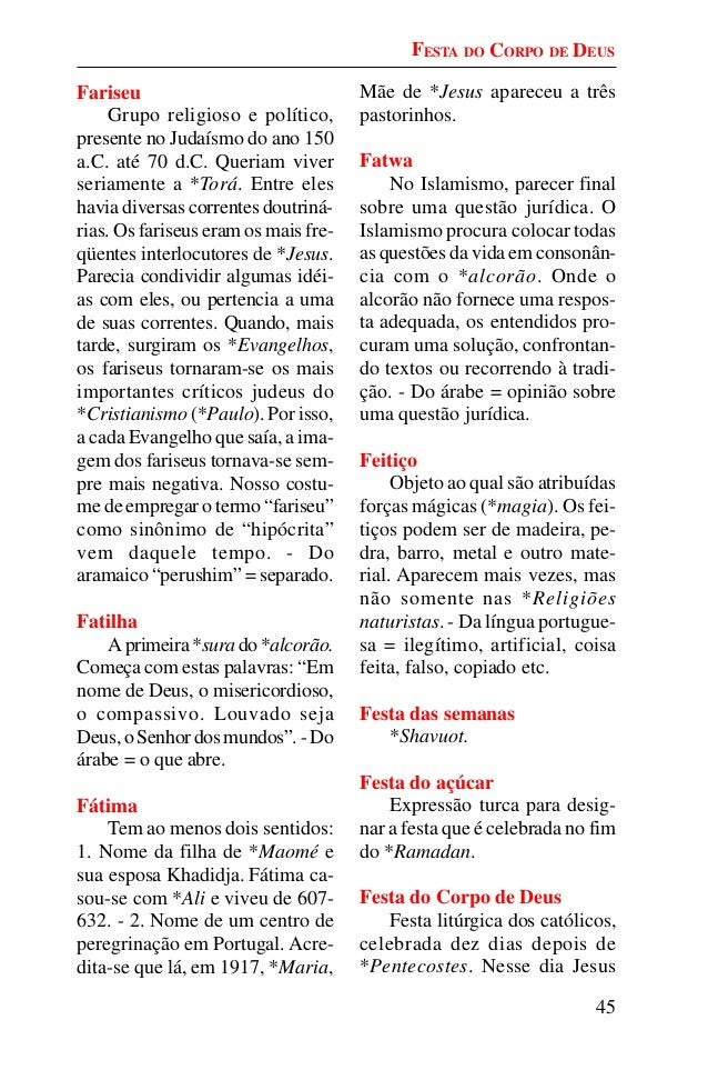 44. 44. 45 Fariseu Grupo religioso e político, presente no Judaísmo do ano 150 a.C. até 70 d.C. Queriam viver seriamente a *Torá. Entre eles havia diversas correntes doutriná- rias. Os fariseus eram os mais fre- qüentes interlocutores de *Jesus. Parecia condividir algumas idéi- as com eles, ou pertencia a uma de suas correntes. Quando, mais tarde, surgiram os *Evangelhos, os fariseus tornaram-se os mais importantes críticos judeus do *Cristianismo (*Paulo). Por isso, a cada Evangelho que saía, a ima- gem dos fariseus tornava-se sem- pre mais negativa. Nosso costu- me de empregar o termo “fariseu” como sinônimo de “hipócrita” vem daquele tempo. - Do aramaico “perushim” = separado. Fatilha Aprimeira*surado*alcorão. Começa com estas palavras: “Em nome de Deus, o misericordioso, o compassivo. Louvado seja Deus,oSenhordosmundos”.-Do árabe = o que abre. Fátima Tem ao menos dois sentidos: 1. Nome da filha de *Maomé e sua esposa Khadidja. Fátima ca- sou-se com *Ali e viveu de 607- 632. - 2. Nome de um centro de peregrinação em Portugal. Acre- dita-se que lá, em 1917, *Maria, Mãe de *Jesus apareceu a três pastorinhos. Fatwa No Islamismo, parecer final sobre uma questão jurídica. O Islamismo procura colocar todas as questões da vida em consonân- cia com o *alcorão. Onde o alcorão não fornece uma respos- ta adequada, os entendidos pro- curam uma solução, confrontan- do textos ou recorrendo à tradi- ção. - Do árabe = opinião sobre uma questão jurídica. Feitiço Objeto ao qual são atribuídas forças mágicas (*magia). Os fei- tiços podem ser de madeira, pe- dra, barro, metal e outro mate- rial. Aparecem mais vezes, mas não somente nas *Religiões naturistas. - Da língua portugue- sa = ilegítimo, artificial, coisa feita, falso, copiado etc. Festa das semanas *Shavuot. Festa do açúcar Expressão turca para desig- nar a festa que é celebrada no fim do *Ramadan. Festa do Corpo de Deus Festa litúrgica dos católicos, celebrada dez dias depois de *Pentecostes. Nesse dia Jesus FESTA DO CORPO DE DEUS