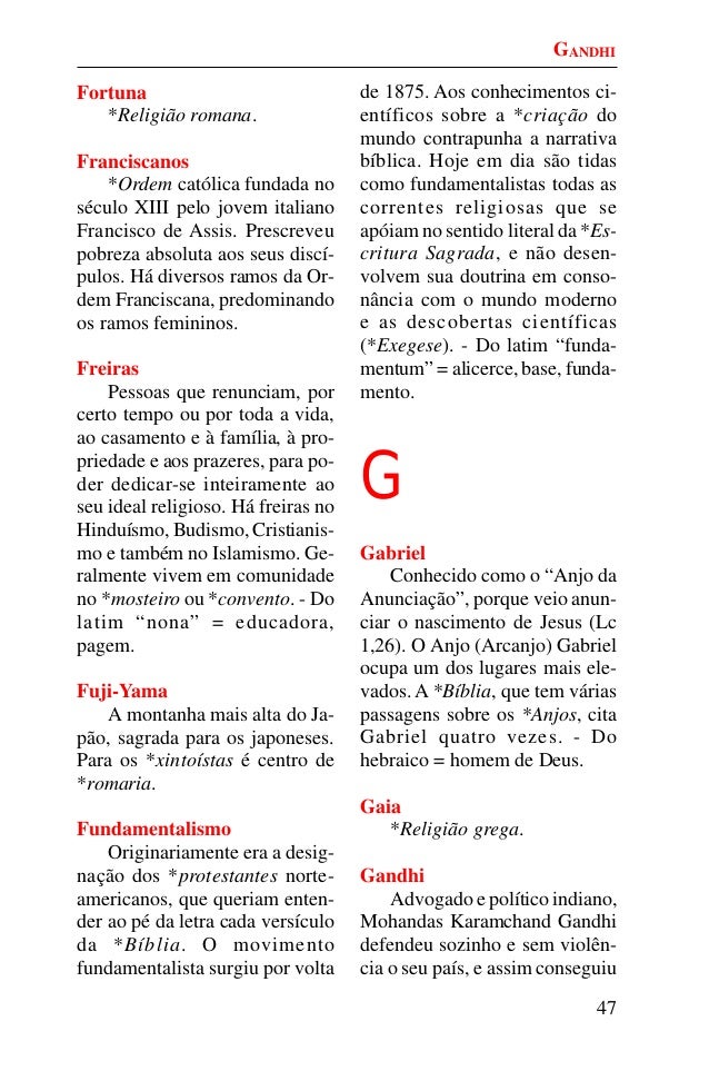 46. 46. 47 Fortuna *Religião romana. Franciscanos *Ordem católica fundada no século XIII pelo jovem italiano Francisco de Assis. Prescreveu pobreza absoluta aos seus discí- pulos. Há diversos ramos da Or- dem Franciscana, predominando os ramos femininos. Freiras Pessoas que renunciam, por certo tempo ou por toda a vida, ao casamento e à família, à pro- priedade e aos prazeres, para po- der dedicar-se inteiramente ao seu ideal religioso. Há freiras no Hinduísmo, Budismo, Cristianis- mo e também no Islamismo. Ge- ralmente vivem em comunidade no *mosteiro ou *convento. - Do latim “nona” = educadora, pagem. Fuji-Yama A montanha mais alta do Ja- pão, sagrada para os japoneses. Para os *xintoístas é centro de *romaria. Fundamentalismo Originariamente era a desig- nação dos *protestantes norte- americanos, que queriam enten- der ao pé da letra cada versículo da *Bíblia. O movimento fundamentalista surgiu por volta de 1875. Aos conhecimentos ci- entíficos sobre a *criação do mundo contrapunha a narrativa bíblica. Hoje em dia são tidas como fundamentalistas todas as correntes religiosas que se apóiam no sentido literal da *Es- critura Sagrada, e não desen- volvem sua doutrina em conso- nância com o mundo moderno e as descobertas científicas (*Exegese). - Do latim “funda- mentum” = alicerce, base, funda- mento. G Gabriel Conhecido como o “Anjo da Anunciação”, porque veio anun- ciar o nascimento de Jesus (Lc 1,26). O Anjo (Arcanjo) Gabriel ocupa um dos lugares mais ele- vados. A *Bíblia, que tem várias passagens sobre os *Anjos, cita Gabriel quatro vezes. - Do hebraico = homem de Deus. Gaia *Religião grega. Gandhi Advogado e político indiano, Mohandas Karamchand Gandhi defendeu sozinho e sem violên- cia o seu país, e assim conseguiu GANDHI