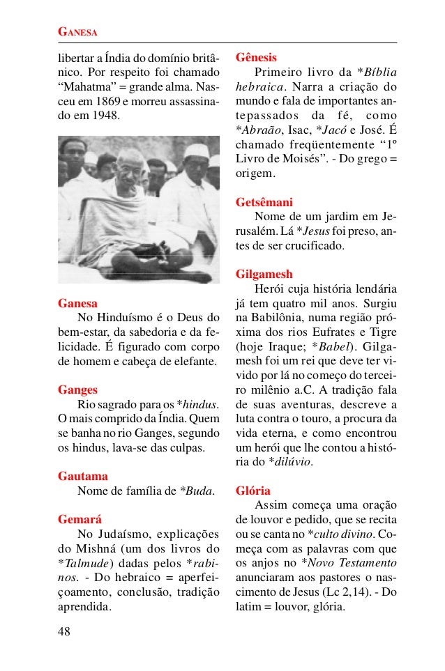 47. 47. 48 libertar a Índia do domínio britâ- nico. Por respeito foi chamado “Mahatma” = grande alma. Nas- ceu em 1869 e morreu assassina- do em 1948. Ganesa No Hinduísmo é o Deus do bem-estar, da sabedoria e da fe- licidade. É figurado com corpo de homem e cabeça de elefante. Ganges Rio sagrado para os *hindus. O mais comprido da Índia. Quem se banha no rio Ganges, segundo os hindus, lava-se das culpas. Gautama Nome de família de *Buda. Gemará No Judaísmo, explicações do Mishná (um dos livros do *Talmude) dadas pelos *rabi- nos. - Do hebraico = aperfei- çoamento, conclusão, tradição aprendida. Gênesis Primeiro livro da *Bíblia hebraica. Narra a criação do mundo e fala de importantes an- tepassados da fé, como *Abraão, Isac, *Jacó e José. É chamado freqüentemente “1º Livro de Moisés”. - Do grego = origem. Getsêmani Nome de um jardim em Je- rusalém. Lá *Jesus foi preso, an- tes de ser crucificado. Gilgamesh Herói cuja história lendária já tem quatro mil anos. Surgiu na Babilônia, numa região pró- xima dos rios Eufrates e Tigre (hoje Iraque; *Babel). Gilga- mesh foi um rei que deve ter vi- vido por lá no começo do tercei- ro milênio a.C. A tradição fala de suas aventuras, descreve a luta contra o touro, a procura da vida eterna, e como encontrou um herói que lhe contou a histó- ria do *dilúvio. Glória Assim começa uma oração de louvor e pedido, que se recita ou se canta no *culto divino. Co- meça com as palavras com que os anjos no *Novo Testamento anunciaram aos pastores o nas- cimento de Jesus (Lc 2,14). - Do latim = louvor, glória. GANESA
