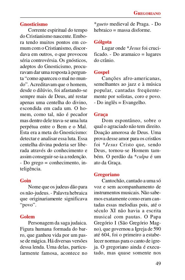 48. 48. 49 Gnosticismo Corrente espiritual do tempo do Cristianismo nascente. Embo- ra tendo muitos pontos em co- mum com o Cristianismo, discor- dava em outros, o que provocou séria controvérsia. Os gnósticos, adeptos do Gnosticismo, procu- ravam dar uma resposta à pergun- ta “como apareceu o mal no mun- do”. Acreditavam que o homem, desde o dilúvio, foi afastando-se sempre mais de Deus, até restar apenas uma centelha do divino, escondida em cada um. O ho- mem, como tal, não é pecador mas dentro dele trava-se uma luta perpétua entre o Bem e o Mal. Esta era a meta do Gnosticismo: detectar e analisar essa luta. Essa centelha divina poderia ser libe- rada através do conhecimento e assim conseguir-se-ia a redenção. - Do grego = conhecimento, in- teligência. Goin Nome que os judeus dão para os não-judeus. - Palavra hebraica que originariamente significava “povo”. Golem Personagem da saga judaica. Figura humana formada do bar- ro, que ganhou vida por um pas- se de mágica. Há diversas versões dessa lenda. Uma delas, particu- larmente famosa, acontece no *gueto medieval de Praga. - Do hebraico = massa disforme. Gólgota Lugar onde *Jesus foi cruci- ficado. - Do aramaico = lugares do crânio. Gospel Canções afro-americanas, semelhantes ao jazz e à música popular, cantadas freqüente- mente por solistas, coro e povo. - Do inglês = Evangelho. Graça Dom espontâneo, sobre o qual o agraciado não tem direito. Doação amorosa de Deus. Uma prova desse amor para os cristãos foi *Jesus Cristo que, sendo Deus, tornou-se Homem tam- bém. O perdão da *culpa é um ato da Graça. Gregoriano Cantochão, cantado a uma só voz e sem acompanhamento de instrumentos musicais. Não sabe- mos exatamente como eram can- tadas essas melodias pois, até o século XI não havia a escrita musical com pautas. O Papa Gregório I (São Gregório Mag- no), que governou a Igreja de 590 até 604, foi o primeiro a estabe- lecer normas para o canto de igre- ja. O gregoriano ainda é execu- tado, mas quase somente nos GREGORIANO