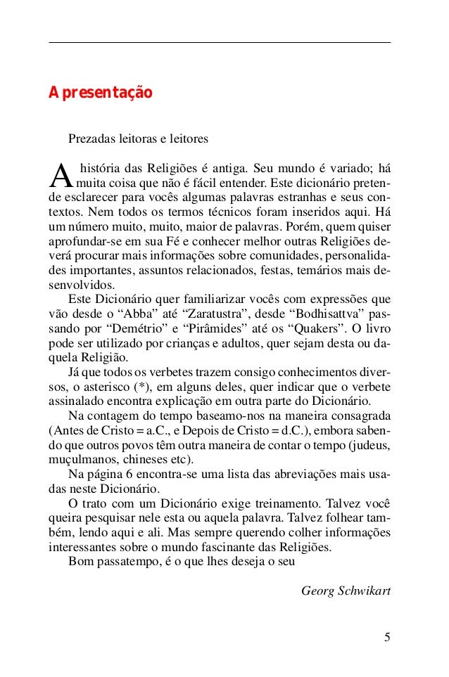 4. 4. 5 Apresentação Prezadas leitoras e leitores A história das Religiões é antiga. Seu mundo é variado; há muita coisa que não é fácil entender. Este dicionário preten- de esclarecer para vocês algumas palavras estranhas e seus con- textos. Nem todos os termos técnicos foram inseridos aqui. Há um número muito, muito, maior de palavras. Porém, quem quiser aprofundar-se em sua Fé e conhecer melhor outras Religiões de- verá procurar mais informações sobre comunidades, personalida- des importantes, assuntos relacionados, festas, temários mais de- senvolvidos. Este Dicionário quer familiarizar vocês com expressões que vão desde o “Abba” até “Zaratustra”, desde “Bodhisattva” pas- sando por “Demétrio” e “Pirâmides” até os “Quakers”. O livro pode ser utilizado por crianças e adultos, quer sejam desta ou da- quela Religião. Já que todos os verbetes trazem consigo conhecimentos diver- sos, o asterisco (*), em alguns deles, quer indicar que o verbete assinalado encontra explicação em outra parte do Dicionário. Na contagem do tempo baseamo-nos na maneira consagrada (Antes de Cristo = a.C., e Depois de Cristo = d.C.), embora saben- do que outros povos têm outra maneira de contar o tempo (judeus, muçulmanos, chineses etc). Na página 6 encontra-se uma lista das abreviações mais usa- das neste Dicionário. O trato com um Dicionário exige treinamento. Talvez você queira pesquisar nele esta ou aquela palavra. Talvez folhear tam- bém, lendo aqui e ali. Mas sempre querendo colher informações interessantes sobre o mundo fascinante das Religiões. Bom passatempo, é o que lhes deseja o seu Georg Schwikart