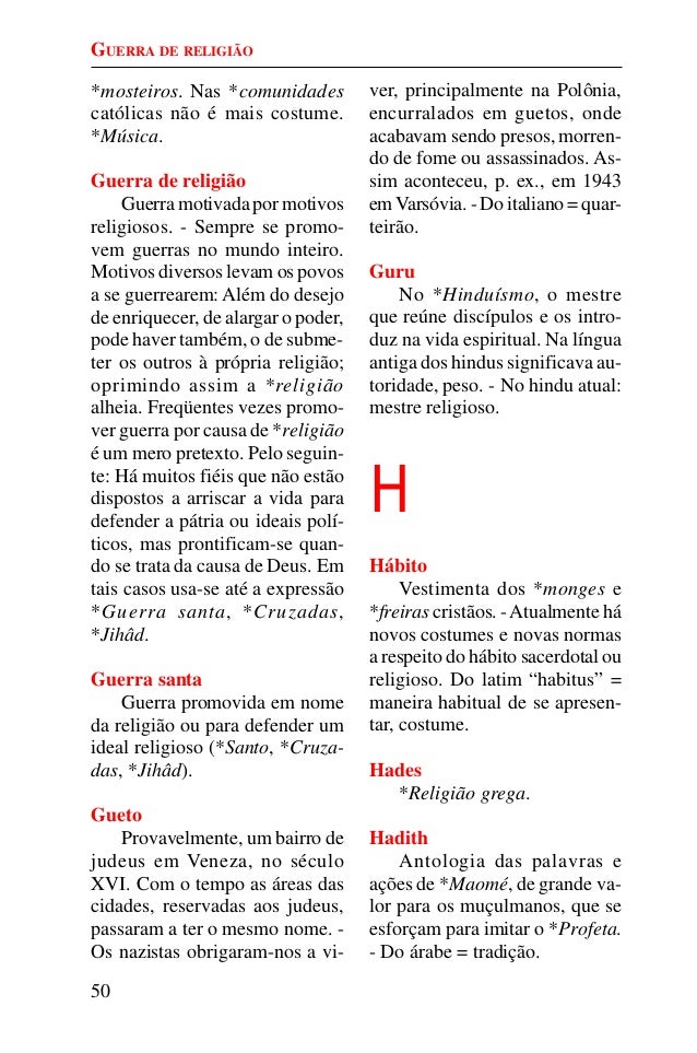 49. 49. 50 *mosteiros. Nas *comunidades católicas não é mais costume. *Música. Guerra de religião Guerra motivada por motivos religiosos. - Sempre se promo- vem guerras no mundo inteiro. Motivos diversos levam os povos a se guerrearem: Além do desejo de enriquecer, de alargar o poder, pode haver também, o de subme- ter os outros à própria religião; oprimindo assim a *religião alheia. Freqüentes vezes promo- ver guerra por causa de *religião é um mero pretexto. Pelo seguin- te: Há muitos fiéis que não estão dispostos a arriscar a vida para defender a pátria ou ideais polí- ticos, mas prontificam-se quan- do se trata da causa de Deus. Em tais casos usa-se até a expressão *Guerra santa, *Cruzadas, *Jihâd. Guerra santa Guerra promovida em nome da religião ou para defender um ideal religioso (*Santo, *Cruza- das, *Jihâd). Gueto Provavelmente, um bairro de judeus em Veneza, no século XVI. Com o tempo as áreas das cidades, reservadas aos judeus, passaram a ter o mesmo nome. - Os nazistas obrigaram-nos a vi- ver, principalmente na Polônia, encurralados em guetos, onde acabavam sendo presos, morren- do de fome ou assassinados. As- sim aconteceu, p. ex., em 1943 emVarsóvia. - Do italiano = quar- teirão. Guru No *Hinduísmo, o mestre que reúne discípulos e os intro- duz na vida espiritual. Na língua antiga dos hindus significava au- toridade, peso. - No hindu atual: mestre religioso. H Hábito Vestimenta dos *monges e *freiras cristãos. -Atualmente há novos costumes e novas normas a respeito do hábito sacerdotal ou religioso. Do latim “habitus” = maneira habitual de se apresen- tar, costume. Hades *Religião grega. Hadith Antologia das palavras e ações de *Maomé, de grande va- lor para os muçulmanos, que se esforçam para imitar o *Profeta. - Do árabe = tradição. GUERRA DE RELIGIÃO