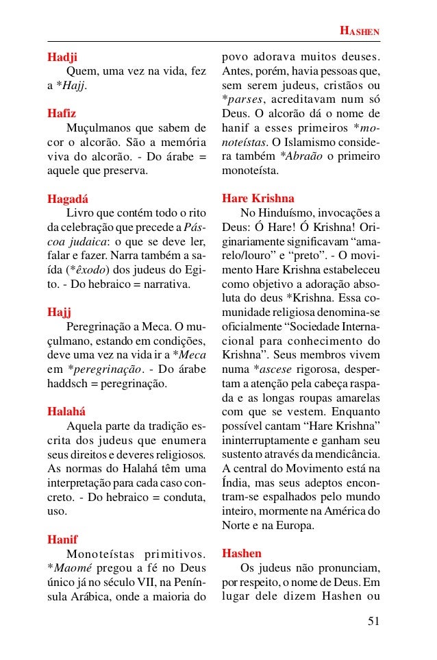 50. 50. 51 Hadji Quem, uma vez na vida, fez a *Hajj. Hafiz Muçulmanos que sabem de cor o alcorão. São a memória viva do alcorão. - Do árabe = aquele que preserva. Hagadá Livro que contém todo o rito da celebração que precede a Pás- coa judaica: o que se deve ler, falar e fazer. Narra também a sa- ída (*êxodo) dos judeus do Egi- to. - Do hebraico = narrativa. Hajj Peregrinação a Meca. O mu- çulmano, estando em condições, deve uma vez na vida ir a *Meca em *peregrinação. - Do árabe haddsch = peregrinação. Halahá Aquela parte da tradição es- crita dos judeus que enumera seus direitos e deveres religiosos. As normas do Halahá têm uma interpretação para cada caso con- creto. - Do hebraico = conduta, uso. Hanif Monoteístas primitivos. *Maomé pregou a fé no Deus único já no século VII, na Penín- sula Arábica, onde a maioria do povo adorava muitos deuses. Antes, porém, havia pessoas que, sem serem judeus, cristãos ou *parses, acreditavam num só Deus. O alcorão dá o nome de hanif a esses primeiros *mo- noteístas. O Islamismo conside- ra também *Abraão o primeiro monoteísta. Hare Krishna No Hinduísmo, invocações a Deus: Ó Hare! Ó Krishna! Ori- ginariamente significavam “ama- relo/louro” e “preto”. - O movi- mento Hare Krishna estabeleceu como objetivo a adoração abso- luta do deus *Krishna. Essa co- munidade religiosa denomina-se oficialmente “Sociedade Interna- cional para conhecimento do Krishna”. Seus membros vivem numa *ascese rigorosa, desper- tam a atenção pela cabeça raspa- da e as longas roupas amarelas com que se vestem. Enquanto possível cantam “Hare Krishna” ininterruptamente e ganham seu sustento através da mendicância. A central do Movimento está na Índia, mas seus adeptos encon- tram-se espalhados pelo mundo inteiro, mormente naAmérica do Norte e na Europa. Hashen Os judeus não pronunciam, por respeito, o nome de Deus. Em lugar dele dizem Hashen ou HASHEN
