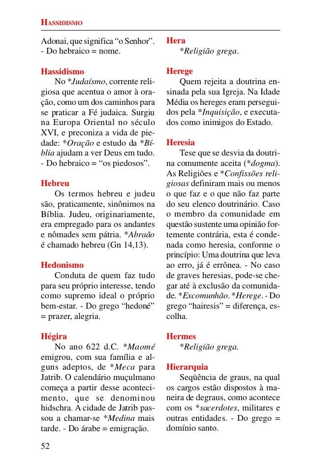 51. 51. 52 Adonai, que significa “o Senhor”. - Do hebraico = nome. Hassidismo No *Judaísmo, corrente reli- giosa que acentua o amor à ora- ção, como um dos caminhos para se praticar a Fé judaica. Surgiu na Europa Oriental no século XVI, e preconiza a vida de pie- dade: *Oração e estudo da *Bí- blia ajudam a ver Deus em tudo. - Do hebraico = “os piedosos”. Hebreu Os termos hebreu e judeu são, praticamente, sinônimos na Bíblia. Judeu, originariamente, era empregado para os andantes e nômades sem pátria. *Abraão é chamado hebreu (Gn 14,13). Hedonismo Conduta de quem faz tudo para seu próprio interesse, tendo como supremo ideal o próprio bem-estar. - Do grego “hedoné” = prazer, alegria. Hégira No ano 622 d.C. *Maomé emigrou, com sua família e al- guns adeptos, de *Meca para Jatrib. O calendário muçulmano começa a partir desse aconteci- mento, que se denominou hidschra. A cidade de Jatrib pas- sou a chamar-se *Medina mais tarde. - Do árabe = emigração. Hera *Religião grega. Herege Quem rejeita a doutrina en- sinada pela sua Igreja. Na Idade Média os hereges eram persegui- dos pela *Inquisição, e executa- dos como inimigos do Estado. Heresia Tese que se desvia da doutri- na comumente aceita (*dogma). As Religiões e *Confissões reli- giosas definiram mais ou menos o que faz e o que não faz parte do seu elenco doutrinário. Caso o membro da comunidade em questão sustente uma opinião for- temente contrária, esta é conde- nada como heresia, conforme o princípio: Uma doutrina que leva ao erro, já é errônea. - No caso de graves heresias, pode-se che- gar até à exclusão da comunida- de. *Excomunhão. *Herege. - Do grego “hairesis” = diferença, es- colha. Hermes *Religião grega. Hierarquia Seqüência de graus, na qual os cargos estão dispostos à ma- neira de degraus, como acontece com os *sacerdotes, militares e outras entidades. - Do grego = domínio santo. HASSIDISMO