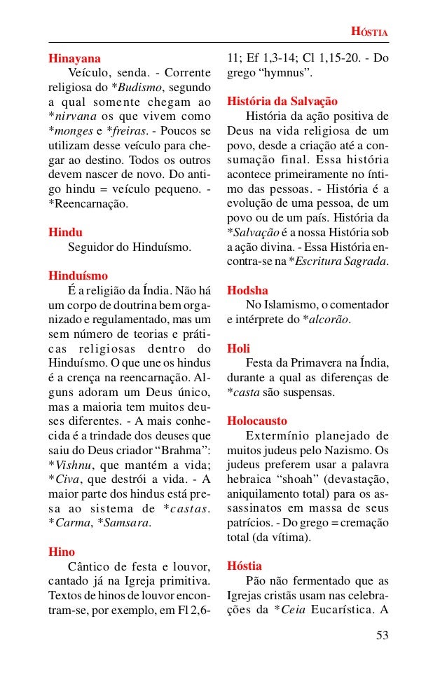 52. 52. 53 Hinayana Veículo, senda. - Corrente religiosa do *Budismo, segundo a qual somente chegam ao *nirvana os que vivem como *monges e *freiras. - Poucos se utilizam desse veículo para che- gar ao destino. Todos os outros devem nascer de novo. Do anti- go hindu = veículo pequeno. - *Reencarnação. Hindu Seguidor do Hinduísmo. Hinduísmo É a religião da Índia. Não há um corpo de doutrina bem orga- nizado e regulamentado, mas um sem número de teorias e práti- cas religiosas dentro do Hinduísmo. O que une os hindus é a crença na reencarnação. Al- guns adoram um Deus único, mas a maioria tem muitos deu- ses diferentes. - A mais conhe- cida é a trindade dos deuses que saiu do Deus criador “Brahma”: *Vishnu, que mantém a vida; *Civa, que destrói a vida. - A maior parte dos hindus está pre- sa ao sistema de *castas. *Carma, *Samsara. Hino Cântico de festa e louvor, cantado já na Igreja primitiva. Textos de hinos de louvor encon- tram-se, por exemplo, em Fl 2,6- 11; Ef 1,3-14; Cl 1,15-20. - Do grego “hymnus”. História da Salvação História da ação positiva de Deus na vida religiosa de um povo, desde a criação até a con- sumação final. Essa história acontece primeiramente no ínti- mo das pessoas. - História é a evolução de uma pessoa, de um povo ou de um país. História da *Salvação é a nossa História sob a ação divina. - Essa História en- contra-se na *Escritura Sagrada. Hodsha No Islamismo, o comentador e intérprete do *alcorão. Holi Festa da Primavera na Índia, durante a qual as diferenças de *casta são suspensas. Holocausto Extermínio planejado de muitos judeus pelo Nazismo. Os judeus preferem usar a palavra hebraica “shoah” (devastação, aniquilamento total) para os as- sassinatos em massa de seus patrícios. - Do grego = cremação total (da vítima). Hóstia Pão não fermentado que as Igrejas cristãs usam nas celebra- ções da *Ceia Eucarística. A HÓSTIA
