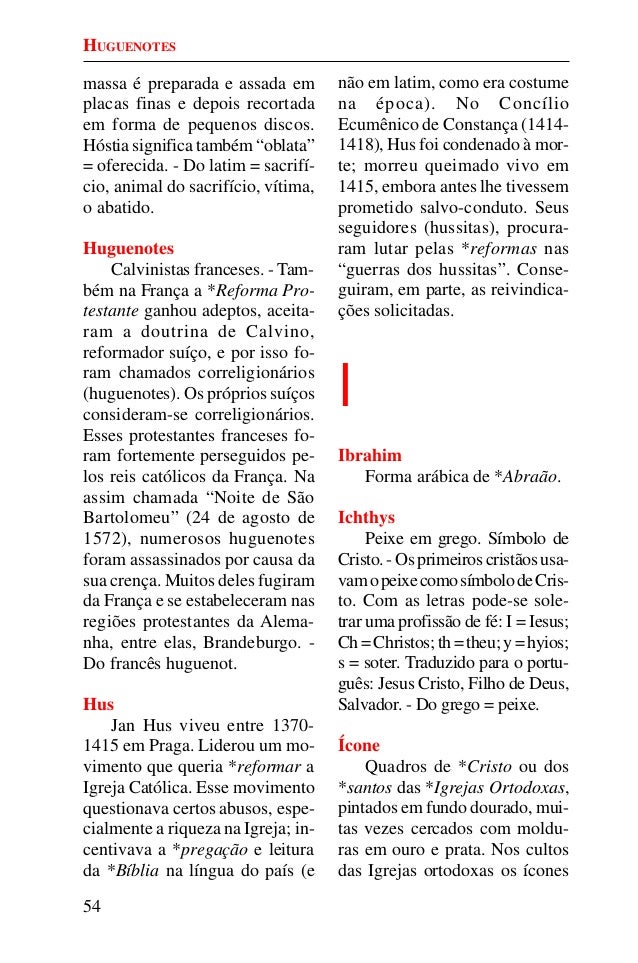 53. 53. 54 massa é preparada e assada em placas finas e depois recortada em forma de pequenos discos. Hóstia significa também “oblata” = oferecida. - Do latim = sacrifí- cio, animal do sacrifício, vítima, o abatido. Huguenotes Calvinistas franceses. - Tam- bém na França a *Reforma Pro- testante ganhou adeptos, aceita- ram a doutrina de Calvino, reformador suíço, e por isso fo- ram chamados correligionários (huguenotes). Os próprios suíços consideram-se correligionários. Esses protestantes franceses fo- ram fortemente perseguidos pe- los reis católicos da França. Na assim chamada “Noite de São Bartolomeu” (24 de agosto de 1572), numerosos huguenotes foram assassinados por causa da sua crença. Muitos deles fugiram da França e se estabeleceram nas regiões protestantes da Alema- nha, entre elas, Brandeburgo. - Do francês huguenot. Hus Jan Hus viveu entre 1370- 1415 em Praga. Liderou um mo- vimento que queria *reformar a Igreja Católica. Esse movimento questionava certos abusos, espe- cialmente a riqueza na Igreja; in- centivava a *pregação e leitura da *Bíblia na língua do país (e não em latim, como era costume na época). No Concílio Ecumênico de Constança (1414- 1418), Hus foi condenado à mor- te; morreu queimado vivo em 1415, embora antes lhe tivessem prometido salvo-conduto. Seus seguidores (hussitas), procura- ram lutar pelas *reformas nas “guerras dos hussitas”. Conse- guiram, em parte, as reivindica- ções solicitadas. I Ibrahim Forma arábica de *Abraão. Ichthys Peixe em grego. Símbolo de Cristo.-Osprimeiroscristãosusa- vamopeixecomosímbolodeCris- to. Com as letras pode-se sole- trar uma profissão de fé: I = Iesus; Ch=Christos;th=theu;y=hyios; s = soter. Traduzido para o portu- guês: Jesus Cristo, Filho de Deus, Salvador. - Do grego = peixe. Ícone Quadros de *Cristo ou dos *santos das *Igrejas Ortodoxas, pintados em fundo dourado, mui- tas vezes cercados com moldu- ras em ouro e prata. Nos cultos das Igrejas ortodoxas os ícones HUGUENOTES