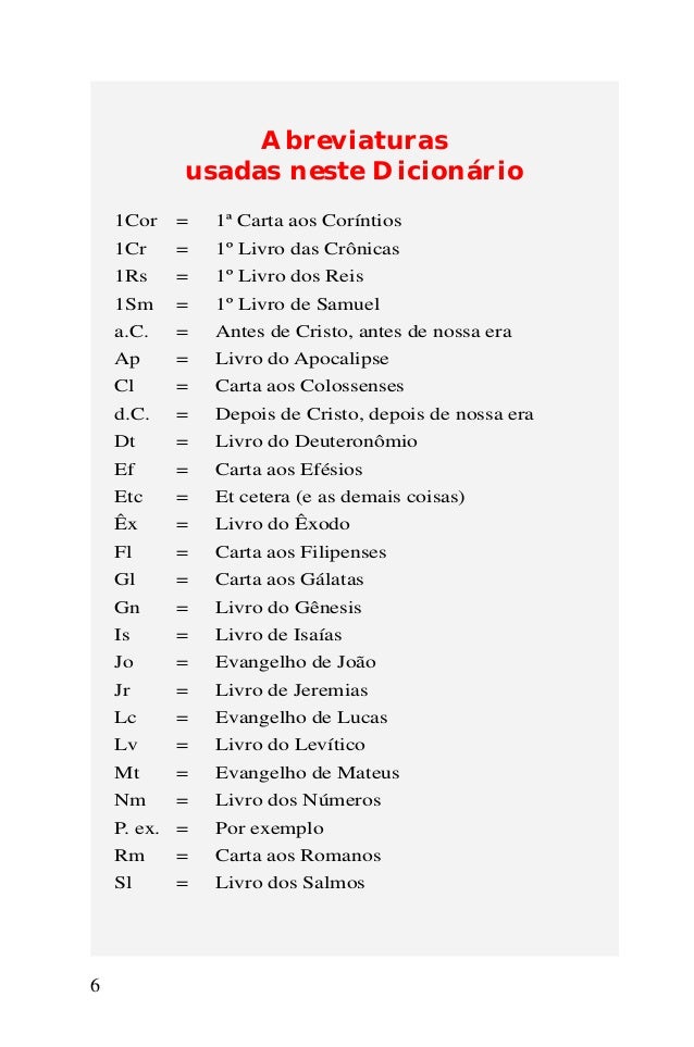 5. 5. 6 Abreviaturas usadas neste Dicionário 1Cor = 1ª Carta aos Coríntios 1Cr = 1º Livro das Crônicas 1Rs = 1º Livro dos Reis 1Sm = 1º Livro de Samuel a.C. = Antes de Cristo, antes de nossa era Ap = Livro do Apocalipse Cl = Carta aos Colossenses d.C. = Depois de Cristo, depois de nossa era Dt = Livro do Deuteronômio Ef = Carta aos Efésios Etc = Et cetera (e as demais coisas) Êx = Livro do Êxodo Fl = Carta aos Filipenses Gl = Carta aos Gálatas Gn = Livro do Gênesis Is = Livro de Isaías Jo = Evangelho de João Jr = Livro de Jeremias Lc = Evangelho de Lucas Lv = Livro do Levítico Mt = Evangelho de Mateus Nm = Livro dos Números P. ex. = Por exemplo Rm = Carta aos Romanos Sl = Livro dos Salmos