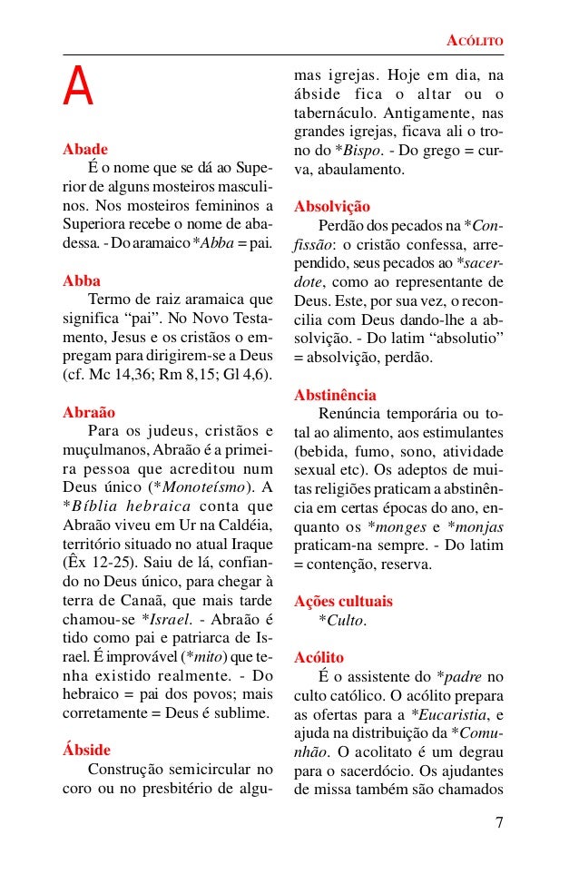 6. 6. 7 A Abade É o nome que se dá ao Supe- rior de alguns mosteiros masculi- nos. Nos mosteiros femininos a Superiora recebe o nome de aba- dessa.-Doaramaico*Abba=pai. Abba Termo de raiz aramaica que significa “pai”. No Novo Testa- mento, Jesus e os cristãos o em- pregam para dirigirem-se a Deus (cf. Mc 14,36; Rm 8,15; Gl 4,6). Abraão Para os judeus, cristãos e muçulmanos,Abraão é a primei- ra pessoa que acreditou num Deus único (*Monoteísmo). A *Bíblia hebraica conta que Abraão viveu em Ur na Caldéia, território situado no atual Iraque (Êx 12-25). Saiu de lá, confian- do no Deus único, para chegar à terra de Canaã, que mais tarde chamou-se *Israel. - Abraão é tido como pai e patriarca de Is- rael. É improvável (*mito) que te- nha existido realmente. - Do hebraico = pai dos povos; mais corretamente = Deus é sublime. Ábside Construção semicircular no coro ou no presbitério de algu- mas igrejas. Hoje em dia, na ábside fica o altar ou o tabernáculo. Antigamente, nas grandes igrejas, ficava ali o tro- no do *Bispo. - Do grego = cur- va, abaulamento. Absolvição Perdão dos pecados na *Con- fissão: o cristão confessa, arre- pendido, seus pecados ao *sacer- dote, como ao representante de Deus. Este, por sua vez, o recon- cilia com Deus dando-lhe a ab- solvição. - Do latim “absolutio” = absolvição, perdão. Abstinência Renúncia temporária ou to- tal ao alimento, aos estimulantes (bebida, fumo, sono, atividade sexual etc). Os adeptos de mui- tas religiões praticam a abstinên- cia em certas épocas do ano, en- quanto os *monges e *monjas praticam-na sempre. - Do latim = contenção, reserva. Ações cultuais *Culto. Acólito É o assistente do *padre no culto católico. O acólito prepara as ofertas para a *Eucaristia, e ajuda na distribuição da *Comu- nhão. O acolitato é um degrau para o sacerdócio. Os ajudantes de missa também são chamados ACÓLITO