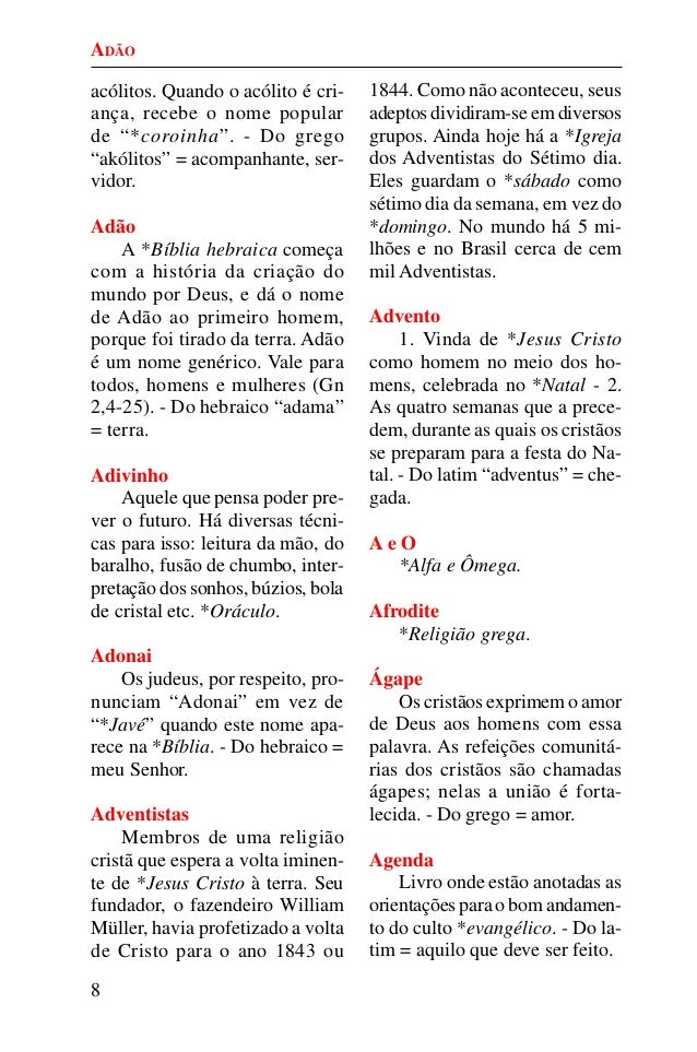 7. 7. 8 acólitos. Quando o acólito é cri- ança, recebe o nome popular de “*coroinha”. - Do grego “akólitos” = acompanhante, ser- vidor. Adão A *Bíblia hebraica começa com a história da criação do mundo por Deus, e dá o nome de Adão ao primeiro homem, porque foi tirado da terra. Adão é um nome genérico. Vale para todos, homens e mulheres (Gn 2,4-25). - Do hebraico “adama” = terra. Adivinho Aquele que pensa poder pre- ver o futuro. Há diversas técni- cas para isso: leitura da mão, do baralho, fusão de chumbo, inter- pretação dos sonhos, búzios, bola de cristal etc. *Oráculo. Adonai Os judeus, por respeito, pro- nunciam “Adonai” em vez de “*Javé” quando este nome apa- rece na *Bíblia. - Do hebraico = meu Senhor. Adventistas Membros de uma religião cristã que espera a volta iminen- te de *Jesus Cristo à terra. Seu fundador, o fazendeiro William Müller, havia profetizado a volta de Cristo para o ano 1843 ou 1844. Como não aconteceu, seus adeptos dividiram-se em diversos grupos. Ainda hoje há a *Igreja dos Adventistas do Sétimo dia. Eles guardam o *sábado como sétimo dia da semana, em vez do *domingo. No mundo há 5 mi- lhões e no Brasil cerca de cem mil Adventistas. Advento 1. Vinda de *Jesus Cristo como homem no meio dos ho- mens, celebrada no *Natal - 2. As quatro semanas que a prece- dem, durante as quais os cristãos se preparam para a festa do Na- tal. - Do latim “adventus” = che- gada. A e O *Alfa e Ômega. Afrodite *Religião grega. Ágape Os cristãos exprimem o amor de Deus aos homens com essa palavra. As refeições comunitá- rias dos cristãos são chamadas ágapes; nelas a união é forta- lecida. - Do grego = amor. Agenda Livro onde estão anotadas as orientações para o bom andamen- to do culto *evangélico. - Do la- tim = aquilo que deve ser feito. ADÃO