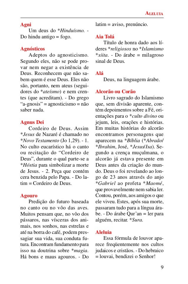 8. 8. 9 Agni Um deus do *Hinduísmo. - Do hindu antigo = fogo. Agnósticos Adeptos do agnosticismo. Segundo eles, não se pode pro- var nem negar a existência de Deus. Reconhecem que não sa- bem quem é esse Deus. Eles não são, portanto, nem ateus (segui- dores do *ateísmo) e nem cren- tes (que acreditam). - Do grego “a-gnosis” = agnosticismo = não saber nada. Agnus Dei Cordeiro de Deus. Assim *Jesus de Nazaré é chamado no *Novo Testamento (Jo 1,29). - 1. No culto eucarístico há o canto ou recitação do “Cordeiro de Deus”, durante o qual parte-se a *Hóstia para simbolizar a morte de Jesus. - 2. Peça que contém cera benzida pelo Papa. - Do la- tim = Cordeiro de Deus. Agouro Predição do futuro baseada no canto ou no vôo das aves. Muitos pensam que, no vôo dos pássaros, nas vísceras dos ani- mais, nos sonhos, nas estrelas e até na borra do café, podem pres- sagiar sua vida, sua conduta fu- tura. Encontram fundamento para isso na doutrina sobre *magia. Há bons e maus agouros. - Do latim = aviso, prenúncio. Aia Tolá Título de honra dado aos lí- deres *religiosos no *Islamismo *xiita. - Do árabe = milagroso sinal de Deus. Alá Deus, na linguagem árabe. Alcorão ou Corão Livro sagrado do Islamismo que, sem divisão aparente, con- tém depoimentos sobre a Fé, ori- entações para o *culto divino ou jejum, leis, orações e histórias. Em muitas histórias do alcorão encontramos personagens que aparecem na *Bíblia (*Abraão/ *Ibrahim, José, *Jesus/Isa). Se- gundo a crença muçulmana, o alcorão já estava presente em Deus antes da criação do mun- do. Deus o foi revelando ao lon- go de 23 anos através do anjo *Gabriel ao profeta *Maomé, que provavelmente nem sabia ler. Contou, porém, aos amigos o que ele viveu. Estes, após sua morte, passaram tudo para a língua ára- be. - Do árabe Qur’an = ler para alguém, recitar. *Sura. Aleluia Essa fórmula de louvor apa- rece freqüentemente nos cultos judaicos e cristãos. - Do hebraico = louvai, bendizei o Senhor! ALELUIA