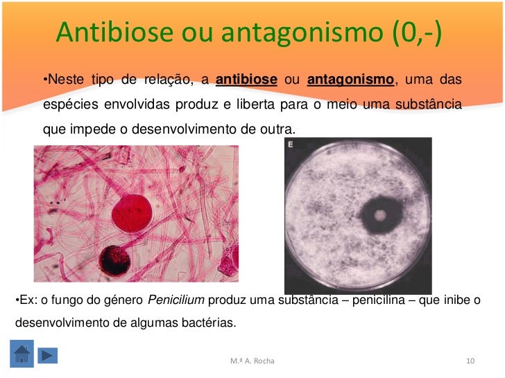 10. 10. Antibiose ou antagonismo (0,-) •Neste tipo de relação, a antibiose ou antagonismo, uma das espécies envolvidas produz e liberta para o meio uma substância que impede o desenvolvimento de outra.•Ex: o fungo do género Penicilium produz uma substância – penicilina – que inibe odesenvolvimento de algumas bactérias. M.ª A. Rocha 10