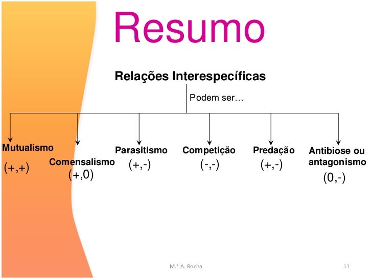 11. 11. Resumo Relações Interespecíficas Podem ser…Mutualismo Parasitismo Competição Predação Antibiose ou Comensalismo (+,-) (-,-) (+,-) antagonismo(+,+) (+,0) (0,-) M.ª A. Rocha 11