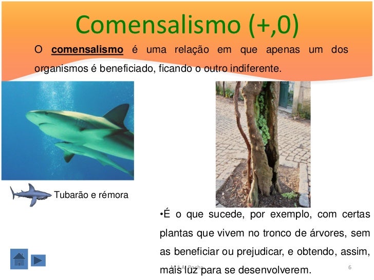 Comensalismo (+,0)O comensalismo é uma relação em que apenas um dosorganismos é beneficiado, ficando o outro indiferente. ...