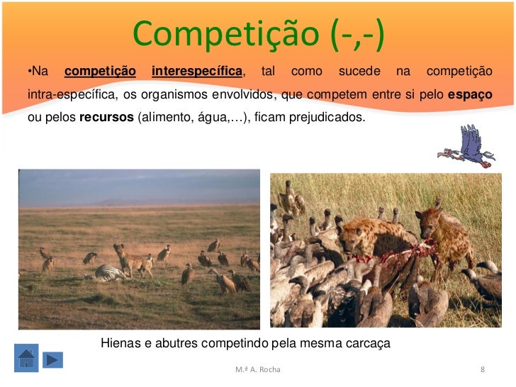 8. 8. Competição (-,-)•Na competição interespecífica, tal como sucede na competiçãointra-específica, os organismos envolvidos, que competem entre si pelo espaçoou pelos recursos (alimento, água,…), ficam prejudicados. Hienas e abutres competindo pela mesma carcaça M.ª A. Rocha 8