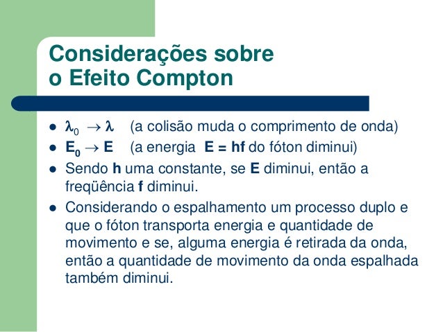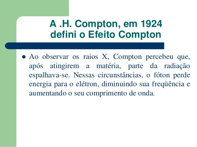 11. 11. A .H. Compton, em 1924 defini o Efeito Compton  Ao observar os raios X, Compton percebeu que, após atingirem a matéria, parte da radiação espalhava-se. Nessas circunstâncias, o fóton perde energia para o elétron, diminuindo sua freqüência e aumentando o seu comprimento de onda.