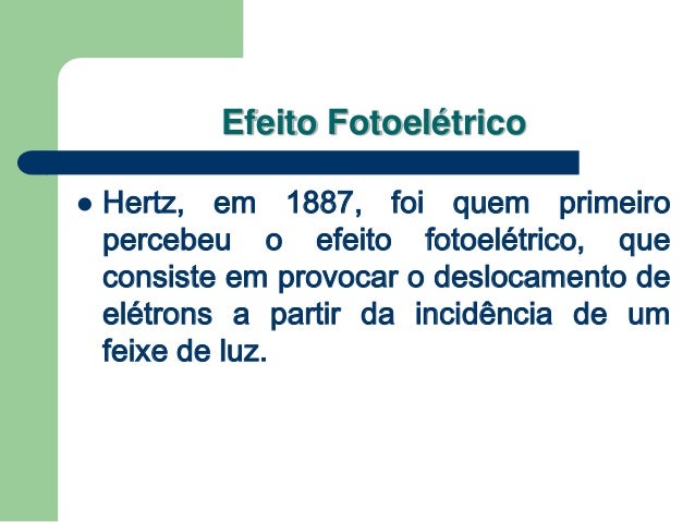 2. 2. Efeito Fotoelétrico  Hertz, em 1887, foi quem primeiro percebeu o efeito fotoelétrico, que consiste em provocar o deslocamento de elétrons a partir da incidência de um feixe de luz.