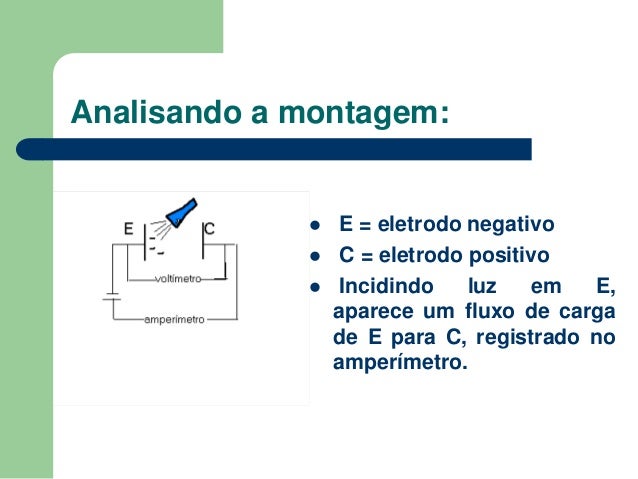 3. 3. Analisando a montagem:  E = eletrodo negativo  C = eletrodo positivo  Incidindo luz em E, aparece um fluxo de carga de E para C, registrado no amperímetro.