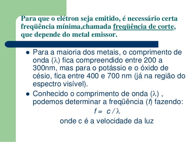 4. 4.  Para a maioria dos metais, o comprimento de onda () fica compreendido entre 200 a 300nm, mas para o potássio e o óxido de césio, fica entre 400 e 700 nm (já na região do espectro visível).  Conhecido o comprimento de onda () , podemos determinar a freqüência (f) fazendo: f = c /  onde c é a velocidade da luz Para que o elétron seja emitido, é necessário certa freqüência mínima,chamada freqüência de corte, que depende do metal emissor.