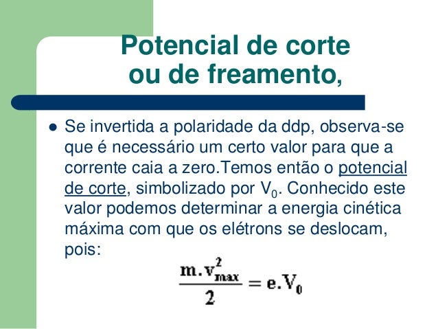 5. 5. Potencial de corte ou de freamento,  Se invertida a polaridade da ddp, observa-se que é necessário um certo valor para que a corrente caia a zero.Temos então o potencial de corte, simbolizado por V0. Conhecido este valor podemos determinar a energia cinética máxima com que os elétrons se deslocam, pois: