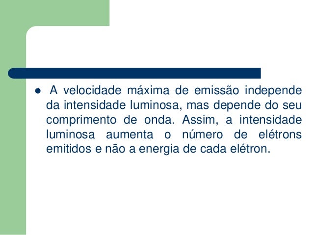 6. 6.  A velocidade máxima de emissão independe da intensidade luminosa, mas depende do seu comprimento de onda. Assim, a intensidade luminosa aumenta o número de elétrons emitidos e não a energia de cada elétron.