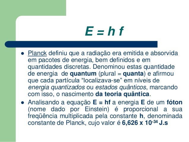 7. 7. E = h f  Planck definiu que a radiação era emitida e absorvida em pacotes de energia, bem definidos e em quantidades discretas. Denominou estas quantidade de energia de quantum (plural = quanta) e afirmou que cada partícula “localizava-se” em níveis de energia quantizados ou estados quânticos, marcando com isso, o nascimento da teoria quântica.  Analisando a equação E = hf a energia E de um fóton (nome dado por Einstein) é proporcional a sua freqüência multiplicada pela constante h, denominada constante de Planck, cujo valor é 6,626 x 10-34 J.s