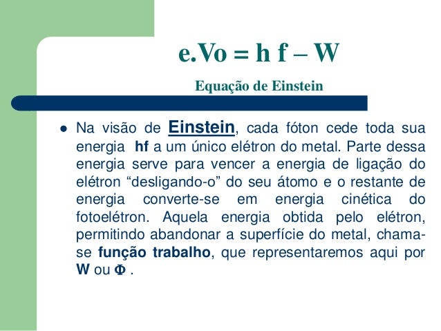 8. 8.  Na visão de Einstein, cada fóton cede toda sua energia hf a um único elétron do metal. Parte dessa energia serve para vencer a energia de ligação do elétron “desligando-o” do seu átomo e o restante de energia converte-se em energia cinética do fotoelétron. Aquela energia obtida pelo elétron, permitindo abandonar a superfície do metal, chama- se função trabalho, que representaremos aqui por W ou  . e.Vo = h f – W Equação de Einstein