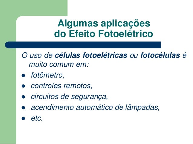 9. 9. Algumas aplicações do Efeito Fotoelétrico O uso de células fotoelétricas ou fotocélulas é muito comum em:  fotômetro,  controles remotos,  circuitos de segurança,  acendimento automático de lâmpadas,  etc.