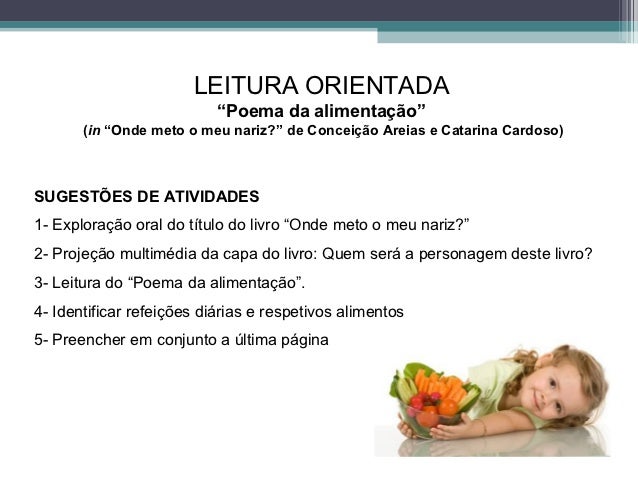 2. 2. LEITURA ORIENTADA “Poema da alimentação” (in “Onde meto o meu nariz?” de Conceição Areias e Catarina Cardoso)SUGESTÕES DE ATIVIDADES1- Exploração oral do título do livro “Onde meto o meu nariz?”2- Projeção multimédia da capa do livro: Quem será a personagem deste livro?3- Leitura do “Poema da alimentação”.4- Identificar refeições diárias e respetivos alimentos5- Preencher em conjunto a última página