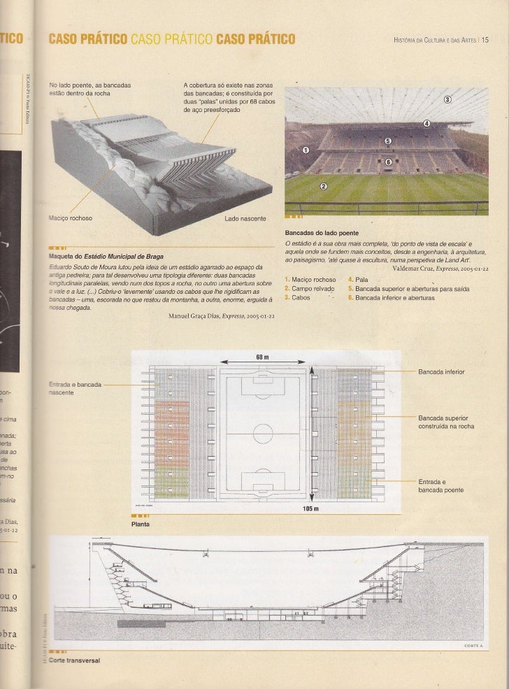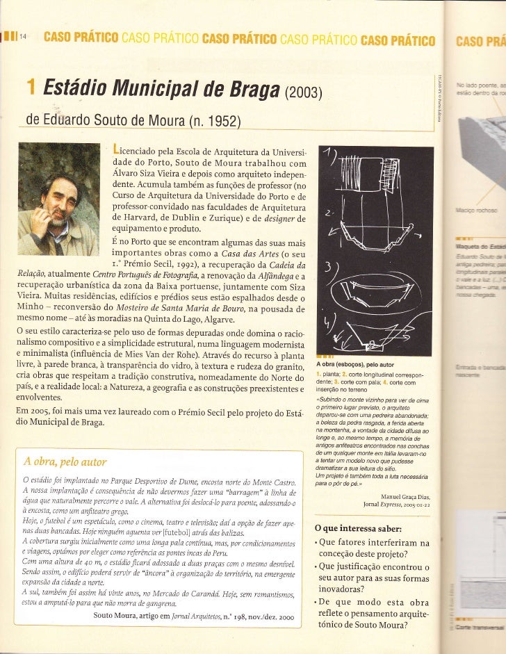 9. 9. Estadio Municipal de Braga eoos) e de Eduardo Souto de Moura (n. 1gb2) icenciado pela Escola de Arquitetura da Universi- dade do Porto, Souto de Moura trabalhou com Áluato Siza Vieira e depois como arquiteto indepen- dente. Acumula também as funções de professor (no Curso de Arquitetura da Universidade do porto e de professor-convidado nas faculdades de Arquitetura de Harvard, de Dublin e Zurique) e de designer de equipamento e produto. É no Porto que se encontram algumas das suas mais ll*:-rE::r: is::;r importantes obras como a Casa das Ártes (o seu : :--ì:, i :i" r. Prémio Secil, r99z), a recuperação da Cadeia da lli .i"a : li . :: ,-.1 " ". :; -; ! ,,: "Ì i4iRelaçã.0, atualmente centro português de Fotografa, a renovaçã o da Alfândega e arecuperação urbanística dazona da Baixa portuense, juntamente com Sizavieira. Muitas residências, edifícios e prédios seus estão espalhados desde oMinho - reconversão do Mosteíro de santa Maria de Bouro, na pousada demesmo nome - até às moradias na euinta do Lago, Algarve.o seu estilo caracteriza-se pelo uso de formas depuradas onde domina o racio-nalismo compositivo e a simplicidade estrutural, numa linguagem modernistae minimalista (influência de Mies van der Rbhe). Através do recurso à plantalivre, à parede branca, à transparência do vidro, à textura e rudeza do gianito, A obra (esboços), pelo autorcria obras que respeitam a tradição construtiva, nomeadamente do Norte do planta; cortelongitudinalcorrespon- dente; coÍte com pala; corte compaís, e a realidade local: a Natureza, a geografia e as construções preexistentes e inserção no terrenoenvolventes. "Subindo o monte vizinho para ver de cima o primeiro lugar previsto, o arquitetoEm zoo5, foi mais uma vez laureado com o prémio secil pelo projeto do Está- deparou-se com uma pedreira abanclonada;dio Municipal de Braga. a beleza da pedra rasgada, a ferida abefta na montanha, a vontade da cidade difusa ao longe e, ao mesmo tempo, a memória de antigos anfìteatros encontrados nas conchas de um qualquer monte em ltália levaram-no a tentar um modelo novo que pudesse dramatizar a sud leitura do slìo. Um projeto e também toda a luta necessária o estídio foí implantado no Parque Desportivo de Dume, enclsta. nlrte d0 Mante castrt. para o pôr de pé.. A nossa ímplantação í consequência de não deuermos;fazer uma "bawagem,, à linha de Manuel Graça Dias, ígua que naturaÌmente perclrre 0 uale. A altemativafoi deslocí-lo para poente, aclossanr1a-o JornaI Expresso,2oo5 or 22 à encostq coma um anfteatro grego. Hoje, o;lutebol é um espetícuÌa, c0m0 o cinema, teatra e teleuísão; rlaí a opção de fazer alte O que interessa saber: nas duas bancadas. Hoje nínguám 6.guenta uer ffute bo1] atrís das baÌizas. A cobertura surgiu ínícialmente c0m0 uma longa pala contínua, mas, por condícionamentos . Que fatores interferiram na e viagens, optímos por eleger clma referêncía 6.s plntes Ìncas do peru. conceção deste projeto? cam uma altura de 4a m, 0 estdclio fcarí adossad.o a cruas ltraças clm 0 mesmo d.esnwel. . Que justificação encontrou o sendo assím, o edífcío poderí seruir cie "âncora" à organização do território, na emergente seu autor para as suas formas expansào da cidade a norte. A suÌ, tambémfoi assim hcí ui.nte (inls, n0 Mercado do Carandrí. Hoje, sem romantismos, inovadoras? est1u a amputí-lo parao,ue não morra de gangrena. . De que modo esta obra Souto Moura, artigo ern lornal Arquitetos,n." r9g, nov./dez. zooo reflete o pensamento arquite- tónico de Souto Moura? -,ilrr$ llf -l$ ,e[!iiãi