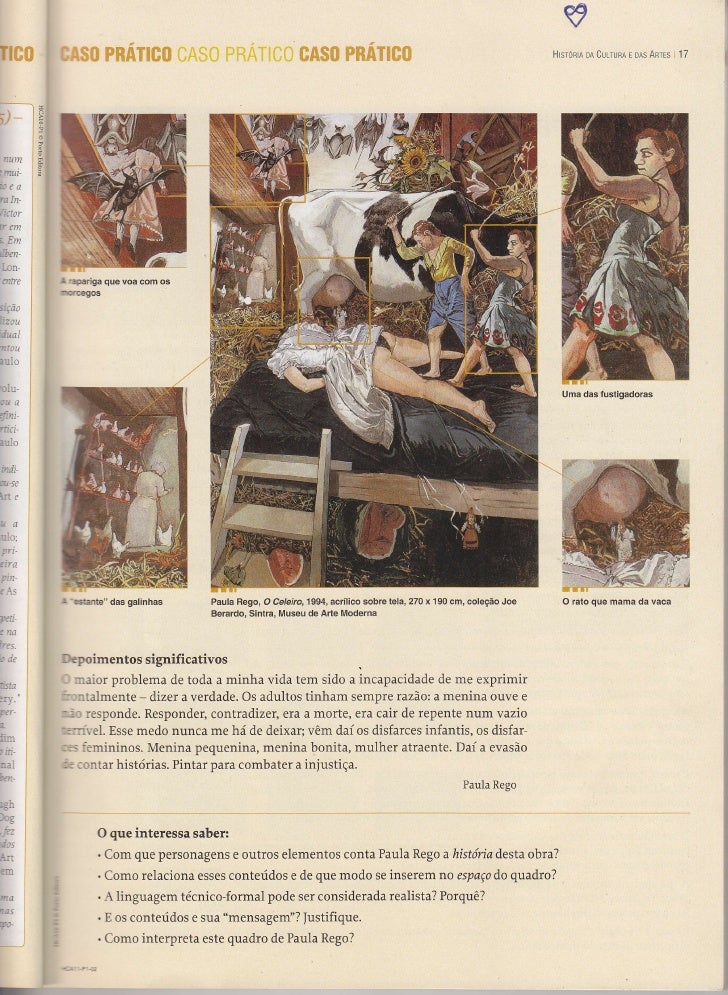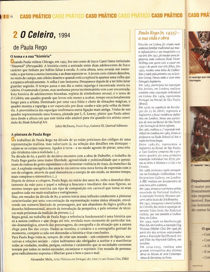 12. 12. T !ri HrsïóRrA DA Curruna r ols Anrrs 17 ìIì;- ;Ì l! lo1:1m:-,tui ià l !t;- In-ì1ems-lm-::n ,,-n :-.:ae.;..,A-l::-o Uma das fustigadoras:-,- a t:.1.íL-,riÉ-,- t:] ,- r!-:.il : ,l li -+sãnte" das galinhas Paula Rego, O Celeíro, 1 994, acrílico sobre tela, 270 x 190 cm, coleção Joe O rato que mama da vaca Berardo, Sintra, Museu de Arte Moderna ) epoimentos significativos - ::raior problema de toda a minha vida tem sido a incapacidade de me exprimir -: ,::talmente - dizer a verdade. Os adultos tinham sempre razão: a menina ouve e :.: responde. Responder, contradizeÍ, eta a morte, era cair de repente num vazio : .::r-,-el. Esse medo nunca me há de deixar; vêm daí os disfarces infantis, os disfar- -.1 -;mininos. Menina pequenina, menina bonita, mulher atraente. Daí a evasão :: ::,ntaÍ histórias. Pintar para combater a injustiça. Paula Rego O que interessa saber: . Com que personagens e outros elementos conta Paula Rego a históriadesta obra? . Como relaciona esses conteúdos e de que modo se inserem no espq4o do quadro?|1:1 .A linguagem técnico-formal pode ser considerada realista? Porquê?1_is.-:::- . E os conteúdos e sua "mensagem"? |ustifique. . Como interpreta este quadro de Paula Rego?-,]