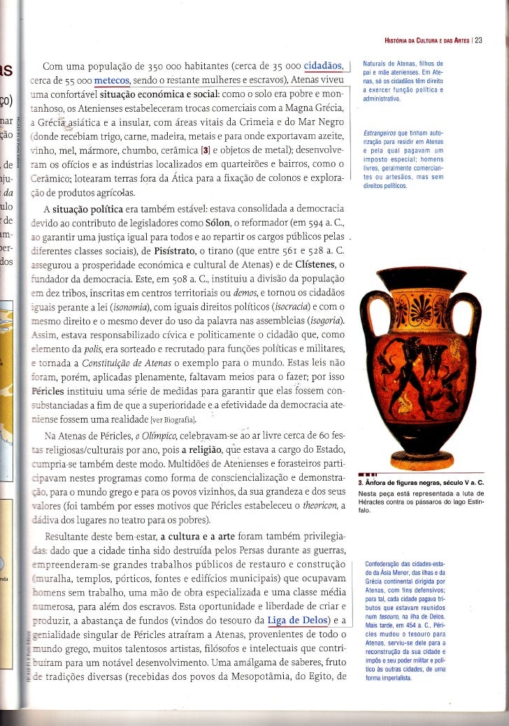 14. 14. HrsróRrA DA CULïuRn r oes Anrrs I 23 Nalurais de Atenas, Íi hos de Com uma população de 35o ooo habitantes (cerca de 35 ooo cidadãos, I pai e mãe atenienses. Em Ate- :erca de 55 ooo metecos, sendo o restante muÌheres e escravos), Atenas viveu nas, só os cidadãos têm direito a exercer Íunção política e :ma confortável situação económica e social como o solo era pobre e mon- adminisïraÌiva. -:,nhoso, os Atenienses estabeleceÍam tÍocas comerciais com a Magna Grécia, : Gréciã.asiática e a insular, com áreas vitais da Crimeia e do Mar Negro Estrangeircs que tinham auto- londe reeebiam trigo, carne, madeira, metais e para onde exportavam azeite, rização para residir em Atenas inho, mel, mármore, chumbo, cerâmica [3] e objetos de metal); desenvolve- e pela qual pagavam um imposÌo especial; homens,de :âm os ofícios e as indústrias localizados em quarteirões e bairros, como o livres, geralmente comercian- les ou artesãos. mas -erâmico; Iotearam terras fora da Atica para a fixação de colonos e explora-nju- sem direitos poìítÌcos.tda =ào de produtos agrícolas.ulo A situação política era também estável: estava consolidada a democraciarde ::i ido ao contributo de legisÌadores como Sólon, o reformador (em 594 a. C.,lm- .: garantir uma justiça iguaÌ para todos e ao repartir os caÍgos públicos pelas .PeÍ- rierentes classes sociais), de Pisístrato, o tirano (que entre 56r e 5zB a. C.dos :-:segurou a prosperidade económica e cultural de Atenas) e de Clístenes, o -:rdador da democracia. Este, em 5oB a. C., instituiu a divisão da população territoriais ou demos, e tornou os cidadãos dez tribos, inscritas em centÍos :r :::ais perante a 1ei (isonomia), com iguais direitos políticos (isocracía) e com o :::smo direito e o mesmo dever do uso da palavra nas assembletas (isogona). --:sim, estava responsabilizado cívica e politicamente o cidadão que, como :-:;nento da polís, era sorteado e recrutade para funções poiíticas e militares, . :crnada a CïnstituíÇão de Atenas o exemplo paÍa o mundo. Estas leis não -::ìm, poïem, aplicadas plenamente, faltavam meios païa o fazer; por isso[, Péricles instituiu uma série de medidas para garantir que elas fossem con-F r-bstanciadas a fim de que a superioridade e.a efetividade da democracia ateI :-:nse fossem uma realidade fver Biografia].tv. a Atenas de Péricles, o Olímpico,celebralzam-se ao ar livre cerca de 6o fes- reÌigiosas/culturais por ano, pois a religião, qüe estava a caÍgo do Estado, = -..:nprìa se tambem deste modo. Multidòes de Atenienses e forasLeiros parti- --:avam nestes programas como forma de consciencialização e demonstra- 3. Âítora de Íiguras negras, século V a. C. ;":. para o mundo gÍego e para os povos vizinhos, da sua grandeza e dos seus Nesta peça está representada a luta de -- ores (foi também por esses motivos que Péricles estabeleceu o theoncon, a Héracles contra os pássaros do lago Estin- Íalo. : iva dos lugares no teatro para os pobres). R.esultante deste bem-estar, a cultura e a aïte foram também privilegia- :---: dado que a cidade tinha sido destruída peÌos Persas durante as gueffas, :::-nreenderam-se grandes trabalhos públicos de restauro e construção ConÍederação das cidades-esta- do da Ásia Menor, das ilhas e da ::-:ralha, tempÌos, pórticos, fontes e edifícios municipais) que ocupavam Grécia continental dirìgida por :,::Ìens sem trabaiho, uma mão de obra especiaizada e uma classe média Atenas, com fins deÍensivos; para tal, cada cìdade pagava tÍi- :--rnerosa, para a1ém dos escravos. Esta oportunidade e liberdade de criar e butos que estavam reunidos num tesouro, na ilha de Delos. :::iuzir, a abastança de fundos (vindos do tesouro da Liga de Delos) e a Mais tarde, em 454 a. C., PéÍi- ; ;-::lalidade singular de Péricles atraíram a Atenas, provenientes de todo o cles mudou o tesouro para Atenas, serviu-se dele para a ; -r--:ndo grego, muitos talentosos artistas, filósofos e intelectuais que contri reconstrução da sua cidade e i : *:am para um notável desenvolvimento.lJma amáÌgama de saberes, fruto impôs o seu poder militar e polí- tico às outÍas cidades. de uma i :. rradições diversas (recebidas dos povos da Mesopotâmia, do Egito, de Íorma imperialisÌ4.