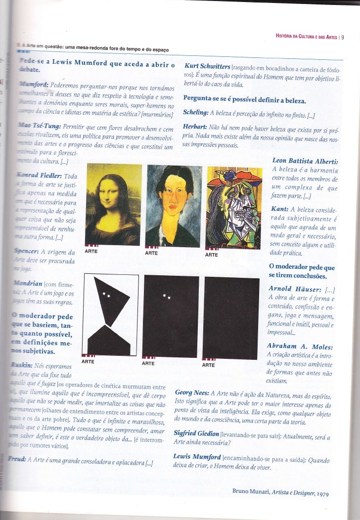 4. 4. HtsTóRtA DA CurÌuRA E DAs ARïES g I f,tÌ _: edonda fora do tempo e do espaço : i.È,SÊ a Lewis Mumford que aceda a abrir o Kurt,schwitters frasgando em bocadinhos a carteÌra c]e fósfo rosl: E umafunção espírítual d.o Homem que tem por objetívo,: Ìi , m-Íorl: Poderemos perguntür_nls pnrque berttí lo do caos da uída. nls tnrnímrs . :- .! (leLtses no que cÌíz respeÌta à tecnologia e seme, Pergunta-se se é possível definir a , .ì.:mínios enquantl seres morais, ,uprr ho^rrc no beleza. .. :.incia e Ìdiotas em maLéria de estéríca? Schelíng: A beÌeza é perceção do ínf nito [murmúrios] nofníto. [...] ;: Tsí-Tung: permitir que cemflores desabrochem e cem Herbart: Ìlão hí nem pode hauer beleza que exista pvr si prr ; - ,t.!ìzem, eÌs uma poÌítíca pãr(i prlmnuer o desenuolui pría. Nada mais exíste além da nossa opíníão qu€ wrsce das nos_ :.:: ,trtes e 0 pragressl tÌas sa s im p rrssòes pessoa ciêncías e que clnstítuí um ì s. ,tra o;florescí :tltura. [...] Leon Battista Alberti: ,,*_r.il J:., ,- Abelezaeahat-monia " .-r.rd Fiedler: Tocla entre todos os membros de :: Art€ Se IUSI- um complexo de que .: -..t.5 n6 medída fazem parte. [...] . , ..:cessíríapara ,_:..:tÇãa de qual- I{ant: A beÌeza conside . ; ; ; .t. rada subjetívamente í Qu€ não seja : _.ì.,:.cl ríe nenhu- aquilo que agrada de um , :tma. [...] modo geral e necessat.í0, sem conceìto aÌgum e utìlí i r : r _-ar.. ,1 origem da ARTE ARTE dade prcítica. ARTE , : Ser proCuracÌa O moderadorpede que se tirem conclusões. ; : t1.ian fcom firme -_.:íumjogoeos Arnolil Hciuser: [...] A obra de aríe í;forma e . . j .j.S SUAS regrLs. contetído, confssão e en_ - ::oderador pede gano, jogo e mensagem, .i *È se baseiem, tan_ funcionaÌ e inútí|, pessoal e :: luanto possível, impessoal... r definições me_ Abraham A. Moles: : : i subjetivas. A criaçào arhstìca e a inrro ! d-il.-7n, ARTE dução no nosso ambíente c5 esperam)s :,.: elaf xe tudo de formas que antes não exístíam. .: ifugaz fos operadores de cinética murmuram entre ..,tnine aquílo que é incompreensíveÌ, Georg Nees: A Arte não í ação rÌa l{atureza, que dê corpo mas do espírÌto. : 1Ìã.0 se pode medir, que imortalíze as coisas qr, ,,tio Isto signif.ca que a Arte pode ter o maíor ínteresse apenas rÌo ;rir loÌhares de entendimento entre Tt,onto de uÌsta dlt intelÌgência. EÌa exige, como os artistas concep- quaÌquer objeto ;a arte pobrel . TurÌo o que é infnìto e marauilhoso, do mundo e da consciência, uma certa parte da teorìa. : o IIomem pode constatar sem cumpreender, amar Siffied Giedion [Ìevantando_se para sair]:,4izz almente, Jejìnir, í este o uerdadeíro objeto da... interrom ié serí a Art e aín rLa ne c e s s drí a? :r:lores vários]. tr--- J r È uti: .-, -11te e uma grande Lewis Mumforil fencaminhando-se paratr consoÌadora e aplacadora a saída]: euando JL [...] deÌxa d,e críar, o Homem dei.xaü cíe uiuer.s:!rr. Bruno Munari, Artìsta e Designer, ry79