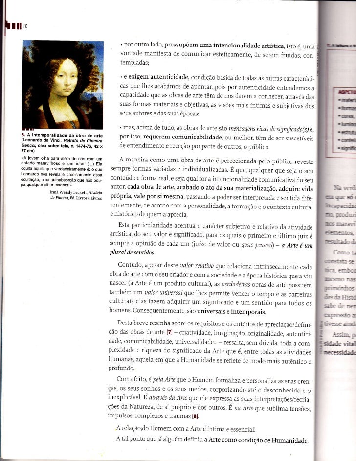 5. 5. [,,, . por outro Ìado, pressupõem uma intencionalidade artística, isto é, uma vontade manifesta de comunicar esteticamente, de serem fruidas, con, templadas; e exigem autenticidade, condição básica de todas as outras característi- cas que thes acabámos de apontar, pois por autenticidade entendemos a capacidade que as obras de arte têm de nos darem a conhecer, através das ,rmt -lufltïih suas formas materiais e objetivas, as visões mais íntimas e subjetivas dos -lfu]l]]]]mfim$ seus autores e das suas épocas; -immW. il .lutlÏtÌÌÍnM . mas, acima de tudo, as obras de arte são mensagens ricas de signìfcado(s) e, .fiffifl]I]ümilt 6, A intemporalidade da obra dê arte por isso, requerem comunicabilidade, ou melhor, têm de ser suscetíveis (Leonardo da Vinci, Retrato de Ginevra .rmlwÍM,Íit Bencci, óleo sobre tela, c.1474-76,42x de entendimento e receção por parte de outros, o púbiico. 37 cm) W|lmffim "A jovem olha para além de nós com um A maneira como uma obra de arte é percecionada peto público reveste entado maravilhoso e luminoso. ( ..) Ela oculta aquilo que verdadeiramente é; o que sempre formas variadas e individualizadas. É que, quaÌquer que seja o seu Leonardo nos revela é precisamente essa ocultação, uma autoabsorção que não pou- conteúdo e forma real, e seja qual for a intencionaÌidade comunicativa do seu pa qualquer olhar exterior." autor, cada obra de arte, acabado o ato da sua materialização, adquire vida },üa mer ; Imã Wendy Beckett, Histórta da Pintura,Êd.Livros e Liwos própria, vale por si mesma, passando a poder ser interpretada e sentida dife- {ffimr ,{r[ürÊ $iti ( rentemente, de acordo com a personalidade, a formação e o contexto cultural iiiúmrmpuaíd *"1 e histórico de quem a aprecia. mmlinr pm":*Jrtm Esta particularidade acentua o carácter subjetivo e relativo da atividade mrinug m;ra*d artística, do seu valor e significado, para os quais o primeiro e último juiz é rmil[pmrenïl,ç- I sempÍe a opinião de cada um (juízo de valor ou g0st0 pessoal) mìIu taLrü: d,n - a Arte é um plural de sentidos. -_u-r_ l-d. rrnr.mmrLc,üãlt1*{{È : contudo, apesar desïe ualor relatiuo que relaciona intrinsecamente cada ÌhrLú:ü- Ê,mhÌ,:ilr obra de afte com o seu criador e com a sociedade e a época histórica que a viu mrdsmt [rÁ-q nascer (a Arte é um produto cultural), as uerdadeiras obras de arte possuem pmln:LliU-ni, também rm ualor uníversal que lhes permite vencer o tempo e as barreiras dks ia Htu:ur culturais e as fazem adquirir um significado e um sentido para todos os maih,rr ú: :rem homens. Consequentemente, são universais e intemporais. Lfl:[ü]r:5r5;ãit ilI Desta breve resenha sobre os requisitos e os critérios de apreciação/defini- $ turpeS:Se a.!,r,, ;; ção das obras de arte [7]- criatividade, imaginação, originalidade, autentici- H -o;-n:- çr,; dade, comunicabilidade, universalidade... - ressaÌta, sem dúvida, toda a com- f qfrrrf,a,4e rital plexidade e riqueza do significado da Arte que é, entre todas as atividades $ mecessí*Cadre humanas, aquela em que a Humanidade se reflete de modo mais autêntico e profundo. com efeito, é pela Arte que o Homem formaiiza e personaliza as suas cren- ças, os seus sonhos e os seus medos, corporizando até o desconhecido e o inexplicável.E atrauís da Arte que eÌe expressa as suas interpretações/recria- ções da Natureza, de si próprio e dos outros. E na Arte que sublima tensões, impulsos, complexos e traumas [g]. A relação;do Homem com a Arte é íntima e essenciall A tal ponto que já alguém definiu a Arte como condição de Humanidade.