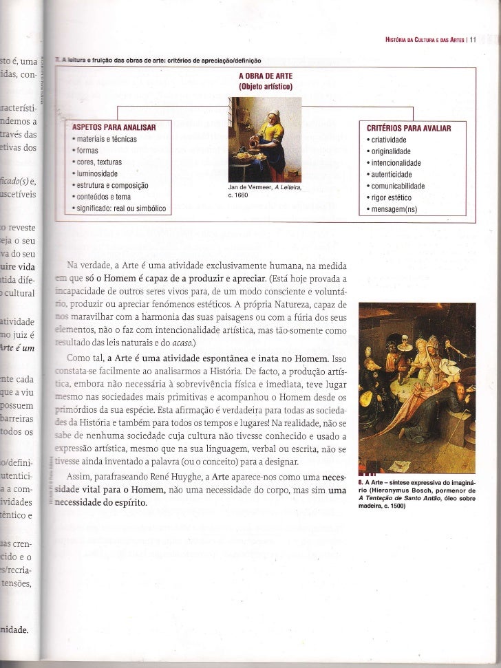 6. 6. HrsróRn ol CulruRl r ons Anres I 1 1sto é, uma ï. t ldúlra e Íruição das obras de arte: critérios de apreciação/deÍiniçãoLidas, con A OBRA DE ARTE (0bjeto artístico)racterísti-ndemos a ASPFTOS PARA ANALISAR CRITÉRIOS PARA AVAIIARtrar,és das . . criatividade materiais e técnicasetir.as dos . formas . originalidade . cores, texturas . intencionalidade . luminosidade . autenticidadeficado(s) e, . estruÌura e composição . comunicabilidadeuscetíveis . conteúdos e tema . rigor estético . signiÍicado: real ou simbólico . mensagem(ns):o reveste;eja o seuim do seupire üda l,a verdade, a Arte é uma atividade exclusivamente humana, na medidartida dife- ::- ;ue só o Homem é capaz de a produzir e apreciar. (Está hoje provada a para, de um modo consciente e voluntá- -:::acidade outros seres vivosr cultural de :.-. :roduzir ou apreciar fenómenos estóticos. Aprópúa Natureza, capaz de - ,; naravilhar com a harmonia das suas paisagens ou com a fúria dos seusatir.idademo juiz é --:::rentos, não o faz com intencionalidade artística, mas tão-somente comotrte é um lomo tal, a Arte é uma atividade espontânea e inata no Homem. Isso :-::stata-se facilmente ao anaÌisarmos a História. De facto, a produção artís-nte cada :-::. embora não necessária à sobrevivência física e imediata, teve lugarque a viu :-:smo nas sociedades mais primitivas e acompanhou o Homem desde ospossuem ::-rórdios da sua espécie. Esta afirmação é verdadeira para todas as socieda-barreiras :=- da História também para todos os tempos e lugares! Na realidade, não se etodos os ..:e de nenhuma sociedade cuja cultura não tivesse conhecido e usado a =r:ressão artística, mesmo que na sua linguagem, verbal ou escrita, não seiotdefini- ; :;:sse ainda inventado a palavra (ou o conceito) para a designar.utentici- ; -tssim, parafraseando René Huyghe, a Arte aparece-nos como uma neces- 8. A Arte - síntese expressiva do imaginá-h a com- : ;idade vital para o Homem, não uma necessidade do corpo, mas sim uma rio (Hieronymus Bosch, pormenor de : recessidade do espírito. A Tentação de Santo AnÍão, ólêo sobreirÌdades madeira, c. 1500)têntico euas cren-rido eosirecria-tensões,midade.IT