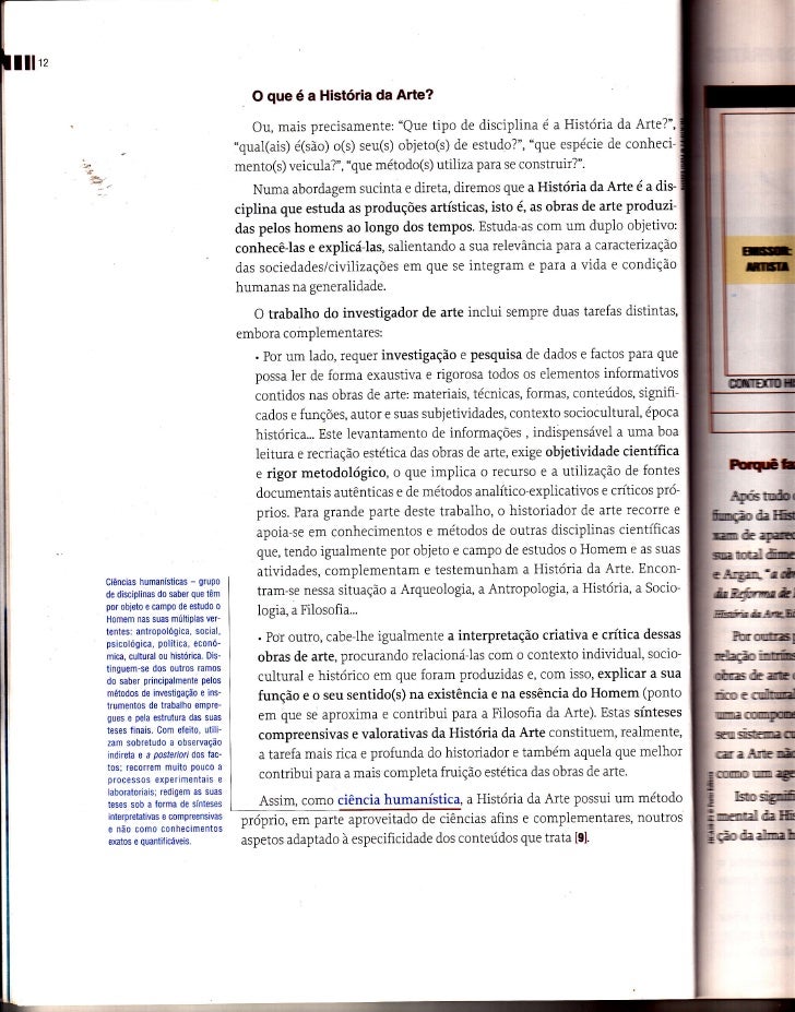 7. 7. lllrz O que é a História da Arte? ou, mais precisamente: "Que tipo de disciplina é a História da Arte?", "qual(ais) é(são) o(s) seu(s) objeto(s) de estudo?", "que espécie de conheci- mento(s) veicula?", "que método(s) utiliza para se construir?". Numa abordagem sucinta e direta, diremos que a História da Arte é a dis- ciplina que estuda as produções artísticas, isto é, as obras de arte produzi- das pelos homens ao longo dos tempos. Estuda-as com um duplo objetivo: conhecê-las e explicá-las, salientando a sua relevância para a calacteÍização das sociedades/civilizações em que se integram e paÍa a vida e condição humanas na generalidade. O trabalho do investigador de arte inclui semple duas tarefas distintas, embora complementares: . Por um lado, requer investigação e pesquisa de dados e factos para que possa ler de forma exaustiva e rigorosa todos os elementos informativos 0mmï[m[]ilr&ll contidos nas obras de arte: matedais, técnicas, formas, conteúdos, signifi- cados e funções, autoÍ e suas subjetividades, contexto sociocultural, época histórica... Este levantamento de informações , indispensável a uma boa leitura objetividade científica e recriação estética das obras de arte, exige e rigor metodológico, o que implica o Iecurso e a utilização de fontes Fbf,fËtl documentais autênticas e de métodos analítico-explicativos e críticos pró- l$rymfu tmffio,u prios. Para grande parte deste trabaÌho, o historiador de arte recore e ffinrmnmrç,,ãrmrm dl& mffiM apoia-se em conhecimentos e métodos de outras disciplinas científicas mnmllrrrlrrnLdFrymmnm que, tendo igualmente por objeto e campo de estudos o Homem e as suas MmeL üWüôl ffifitÌÍÍÍrffi atividades, complementam e testemunham a História da Arte. Encon- mr"ffirgrun, -m dh CÌências humanÍsÌìcas - grupo de disciplinas do saber que têm tram-se nessa situação a Arqueologia, a Antropologia, a História, a Socio- í&ffi-qiftnmmrq&rl por objeto e campo de estudo o logia, a Filosofia... MMüfiÍMdml{ilffiM Homem nas suas múltiplas ver- tentes: antropológica, social, . Por outro, cabe-lhe igualmente a interpretação criativa e crítica dessas Mmm mnÌ]alfillrnlmp psicológica, políÌica, econó- mica, cultural ou histórica. Dis- obras de arte, ploculando relacioná-Ìas com o contexto individuaÌ, socio- mdÏt@qmm ffilrim tìnguem-se dos outros ramos do saber principaìmente pelos cultural e histórico em que foram produzidas e, com isso, explicar a sua rmffinmms demm,u métodos de investigação e ins- função e o seu sentido(s) na existência e na essência doHomem (ponto mfunmre mmiftffiMl Ìrumentos de trabalho emPre- gues e peìa estrutura das suas em que se aproxima e contribui para a Filosofia da Arte). Estas sínteses ï0ummr,tLümlmwüM teses finais. Com eÍeito, utìli- zam sobretudo a observação compreensivas e valorativas da História da Arte constituem, realmente, erlmsümmmrmm indireta e a posterÌorì dos Íac a tarefa mais rica e profunda do historiador e também aquela que melhor ,r0mm m iffiUtM nndftn Ìos; recorrem muito pouco a processos experimentais e contribui paÍa a mais completa fruição estética das obras de arte. ili,ÌrrllÌ]llrlÌli 4mH laboÍatoÍiais; redigem as suas teses sob a Íorma de sÍnteses Assim, como ciência humanística, a História da Arte possui um método fsìfúo sfrWírlrlÌilffi interpretativas e compreensivas próprio, em parte aproveitado de ciências afins e complementares, noutros H m,uffil[d,eM e não como conhecimenÌos exatos e quanÌiÍicáveis. aspetos adaptado à especificidade dos conteúdos que trata [91. iffi pm,,mm *n**m