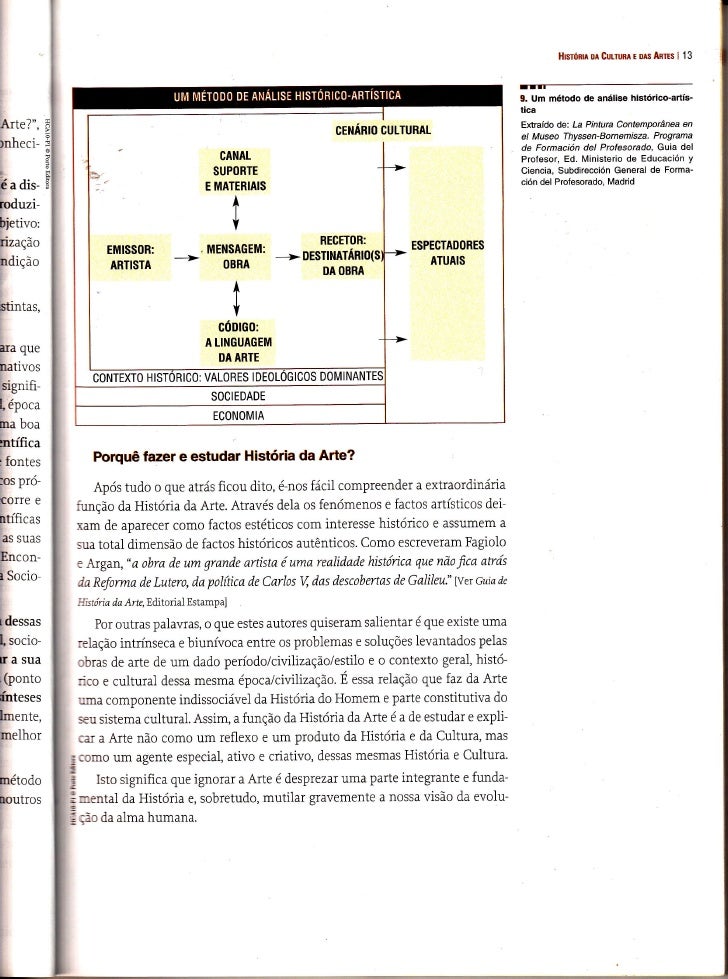 8. 8. HrsníBn DA CurÌun E oÂ$ ARïEs I 1 3 9. Um método de análise histórico-artís tica Extraído de. La Pintura Contemporânea en el Museo Thyssen-Bomemisza. Programa de Formación del Profesorado, Guia del CANAL Profesor, Ed. Ministerio de Educación y SUPORTE Ciencia, Subdirección General de Forma- ción del Profesorado, Madrid E MATERIAIS A I VO: V ao " MENSAGEM: ----ì> ção -> oBRA A I V cÓDrc0: A LINGUAGEM que DA ARTE VOS C0NTEXTO H lST0RlC0: VALORESisnifi-época boa íficafontes Porquê lazer e estudar História da Arte? pro- Após tudo o que atrás ficou dito, é-nos fáci1 compleender a extraordinária rre e função da História da Arte. Através dela os fenómenos e factos artísticos dei- ICAS xam de aparecel como factos estéticos com intelesse histórico e assumem a SUAS sua total dimensão de factos históricos autênticos. Como escleveram Fagiolo on- e Argan, " A lbra de um grande artista á uma realídade histírica que nã0 fca. atrãsSocio- dnReforma de Lutero, da política de Carlos V, das descobertas de Galíleu." lYer Guía de Ifiçóia da Arte,Editorial Estampal Por outras palavras, o que estes autores quiselam salientar é que existe umasoclo- relação intínseca e biunívoca entle os problemas e soluções levantados pelas a sua obras de alte de um dado período/civilização/estilo e o contexto geral, histó- to mico e culturai dessa mesma época/civilização. É essa Ielação que faz da Arte ses uma componente indissociável da História do Homem e païte constitutiva do te, seu sistema cultural. Assim, a função da História da Arte é a de estudar e expli hor car a Arte não como um reflexo e um ploduto da História e da Cultura, mas como um agente especial, ativo e cliativo, dessas mesmas História e Cultura. Isto significa que ignorar a AIte é desprezar uma palte integrante e funda- mental da História e, sobretudo, mutilar glavemente a nossa visão da evolu- ção da alma humana.