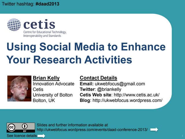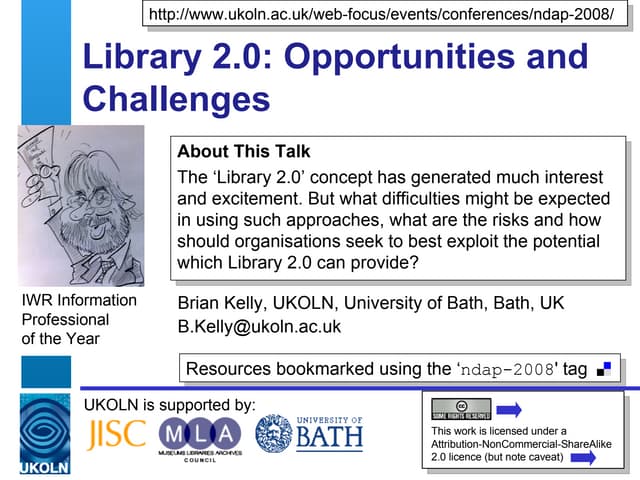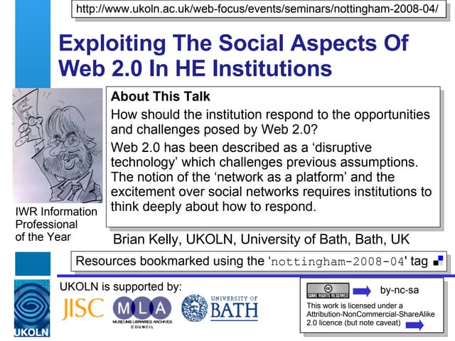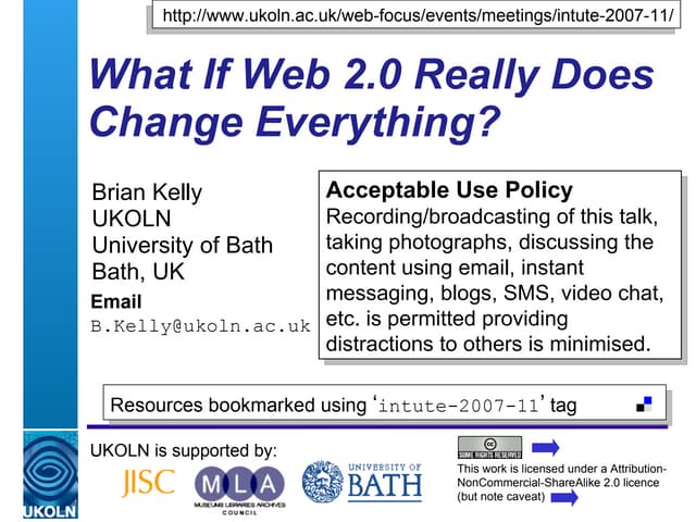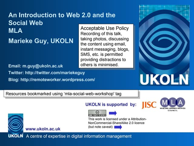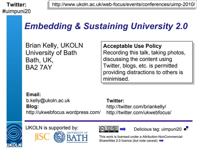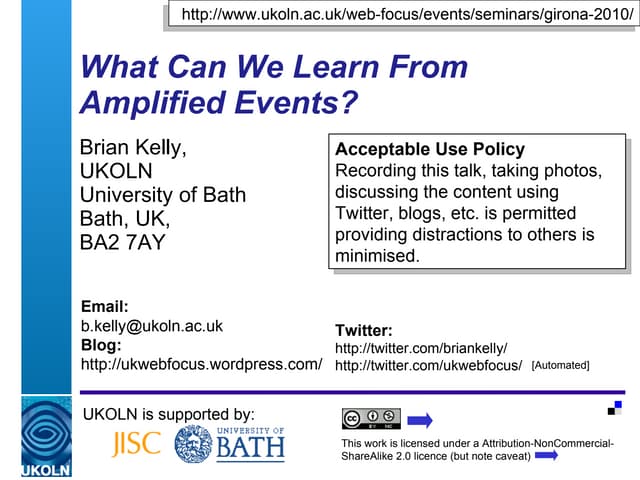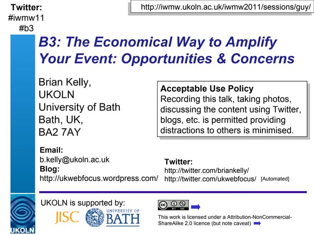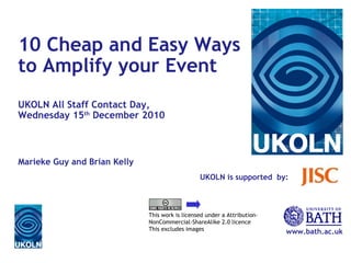 UKOLN is supported by: www.bath.ac.uk This work is licensed under a Attribution-NonCommercial-ShareAlike 2.0 licence This excludes images 10 Cheap and Easy Ways to Amplify your Event UKOLN All Staff Contact Day, Wednesday 15 th December 2010 Marieke Guy and Brian Kelly