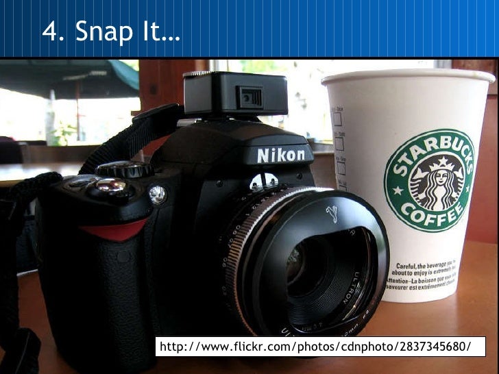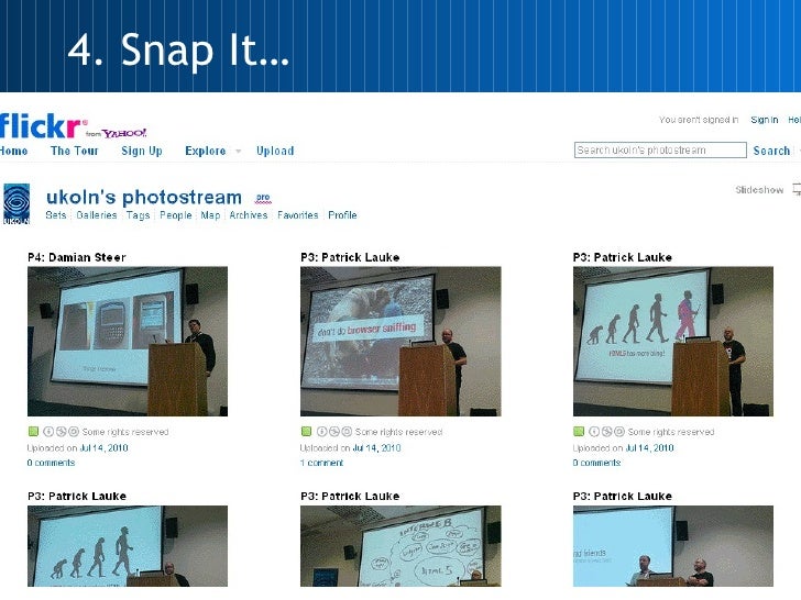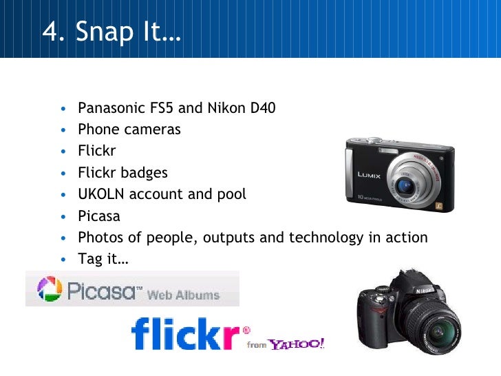 <ul><li>Panasonic FS5 and Nikon D40 </li></ul><ul><li>Phone cameras </li></ul><ul><li>Flickr </li></ul><ul><li>Flickr badges </li></ul><ul><li>UKOLN account and pool </li></ul><ul><li>Picasa </li></ul><ul><li>Photos of people, outputs and technology in action </li></ul><ul><li>Tag it… </li></ul>4. Snap It…
