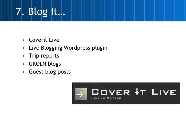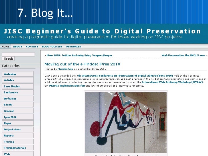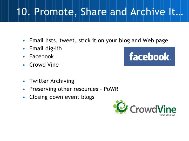 <ul><li>Email lists, tweet, stick it on your blog and Web page </li></ul><ul><li>Email dig-lib </li></ul><ul><li>Facebook </li></ul><ul><li>Crowd Vine </li></ul><ul><li>Twitter Archiving </li></ul><ul><li>Preserving other resources – PoWR </li></ul><ul><li>Closing down event blogs </li></ul>10. Promote, Share and Archive It…