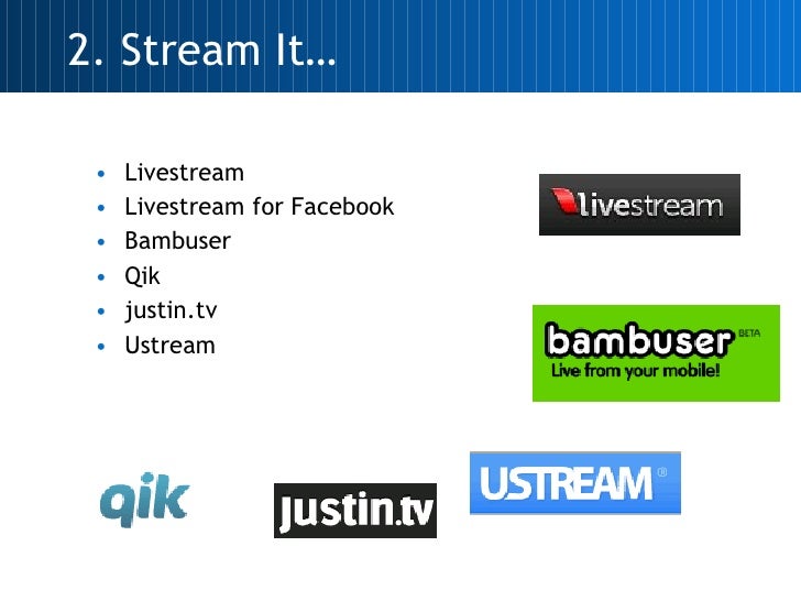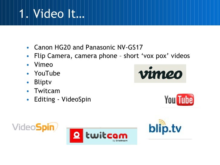 <ul><li>Canon HG20 and Panasonic NV-GS17 </li></ul><ul><li>Flip Camera, camera phone – short ‘vox pox’ videos </li></ul><ul><li>Vimeo </li></ul><ul><li>YouTube </li></ul><ul><li>Bliptv </li></ul><ul><li>Twitcam </li></ul><ul><li>Editing - VideoSpin </li></ul>1. Video It…
