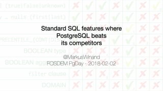 The SQL standard has more than 4300 pages and hundreds of optional features. The number of features offered by different products varies vastly. PostgreSQL implements a relativley large number of them. In this session I present some standard SQL features that work in PostgreSQL, but not in other popular open-source databases. But when it comes to standard conformance, PostgreSQL doesn’t even need to fear the comparison to its commercial competitors: PostgreSQL also supports a few useful standard SQL features that don’t work in any of the three most popular commercial SQL databases.