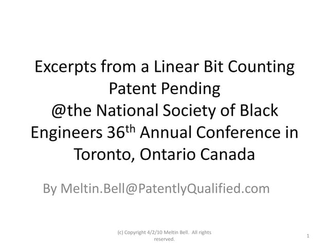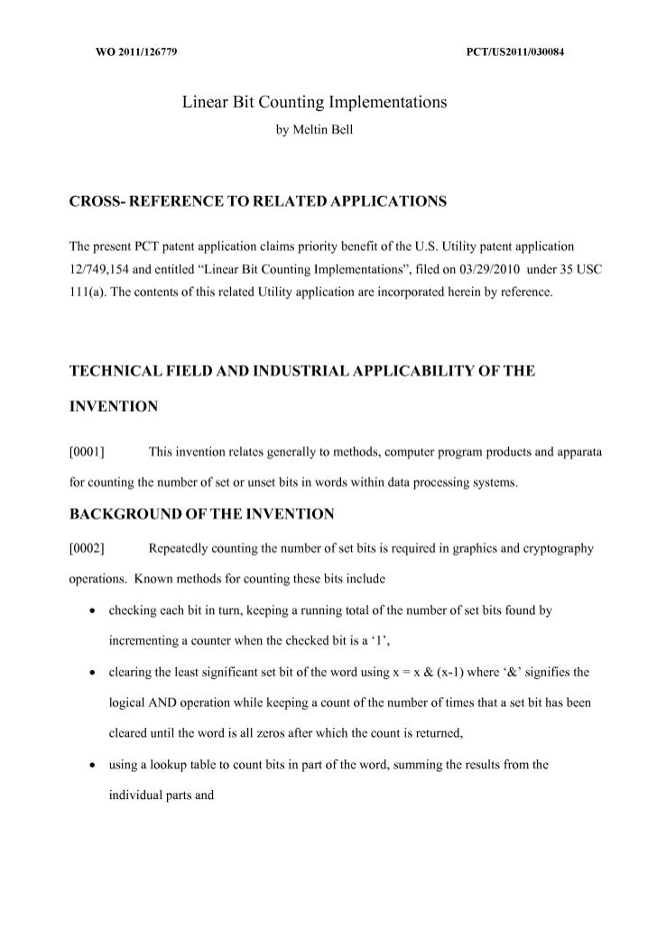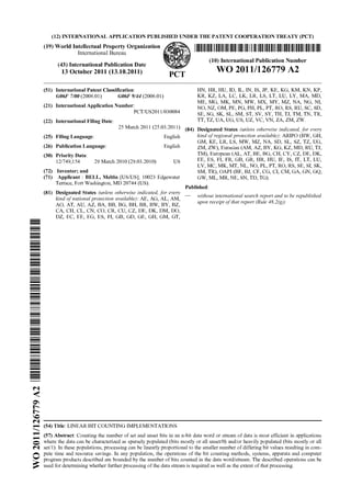 2. 2. WO 2011/126779 peT/US20111030084 Linear Bit Counting Implementations by Meltin Bell CROSS- REFERENCE TO RELATED APPLICATIONS The present PCT patent application claims priority benefit of the u.s. Utility patent application 12/749,154 and entitled "Linear Bit Counting Implementations", filed on 03/29/2010 under 35 USC 111(a). The contents of this related Utility application are incorporated herein by reference. TECHNICAL FIELD AND INDUSTRIAL APPLICABILITY OF THE INVENTION [0001] This invention relates generally to methods, computer program products and apparata for counting the number of set or unset bits in words within data processing systems. BACKGROUND OF THE INVENTION [0002] Repeatedly counting the number of set bits is required in graphics and cryptography operations. Known methods for counting these bits include • checking each bit in tum, keeping a running total of the number of set bits found by incrementing a counter when the checked bit is a '1', • clearing the least significant set bit of the word using x = x & (x-I) where '&' signifies the logical AND operation while keeping a count of the number of times that a set bit has been cleared until the word is all zeros after which the count is returned, • using a lookup table to count bits in part of the word, summing the results from the individual parts and