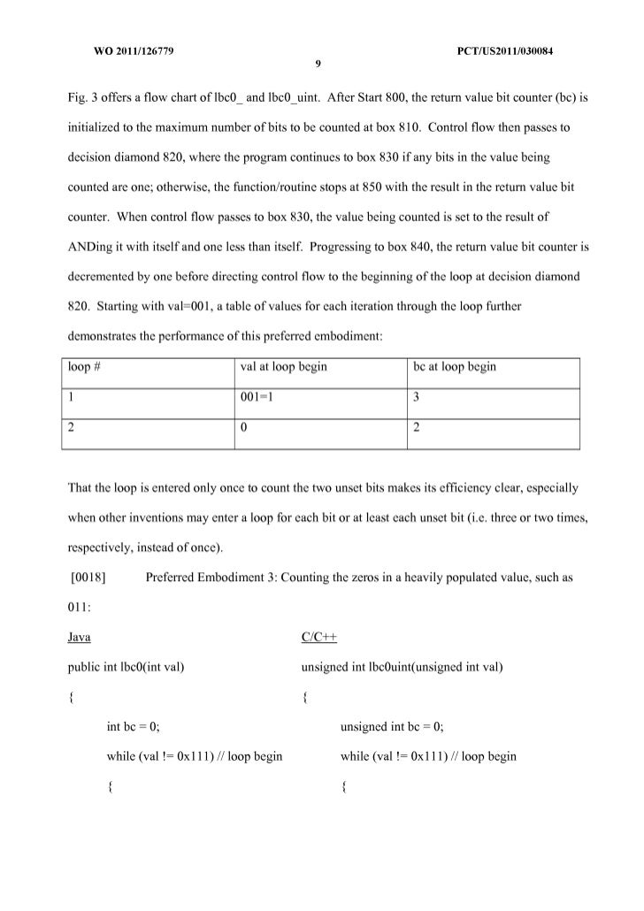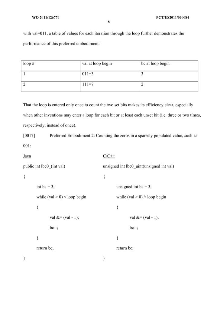 9. 9. WO 2011/126779 peT/US20111030084 8 with val=OII, a table of values for each iteration through the loop further demonstrates the performance of this preferred embodiment: loop # val at loop begin bc at loop begin 1 011=3 3 2 111=7 2 That the loop is entered only once to count the two set bits makes its efficiency clear, especially when other inventions may enter a loop for each bit or at least each unset bit (i.e. three or two times, respectively, instead of once). [0017] Preferred Embodiment 2: Counting the zeros in a sparsely populated value, such as 001: Java CIC++ public int lbcO_(int val) unsigned int lbcO_uint(unsigned int val) { { int bc = 3; unsigned int bc = 3; while (val> 0) II loop begin while (val> 0) II loop begin { { val &= (val - 1); val &= (val- 1); bc--; bc--; } } return bc; return bc; } }